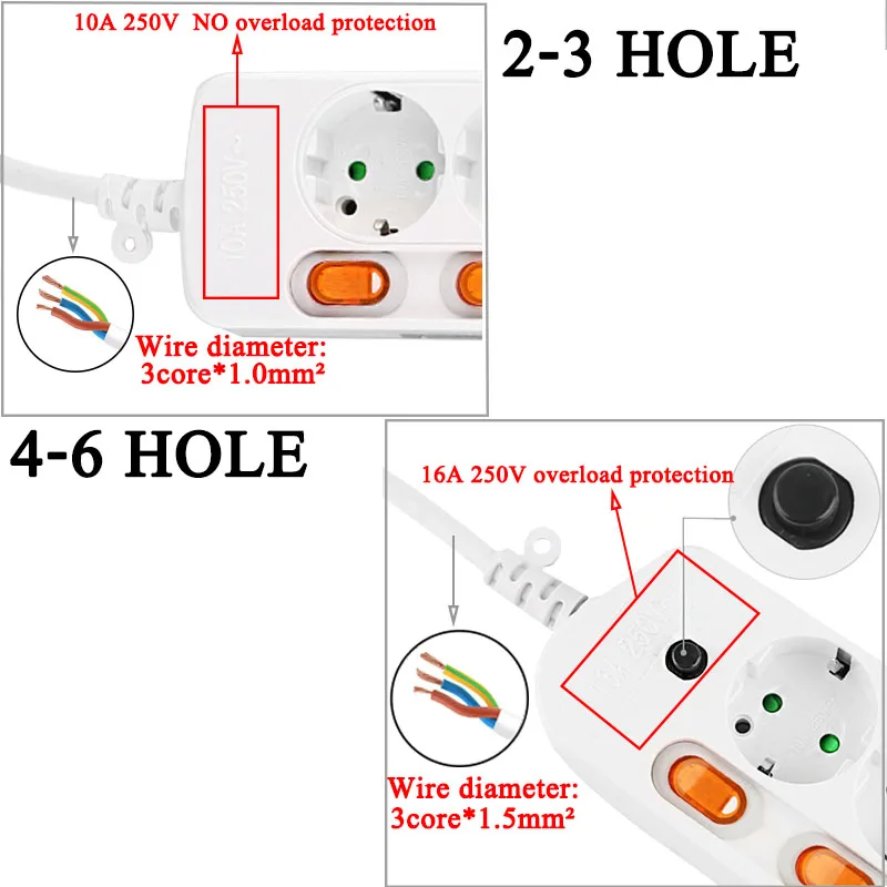 Номинальный ток: 10/16A(2-3 отверстия: 10A)(4-6 отверстий: 16A)