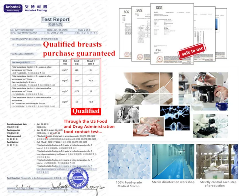 Наши силиконовые формы груди продукты проходят строгий контроль качества, и он прошел сертификацию качества SGS. Он соответствует стандартам Управления по контролю пищевых продуктов и лекарственных средств США для тестирования контакта с пищевыми продуктами. Наши силиконовые формы груди продукты изготовлены из 100% пищевого медицинского силикона, который является самой кожей с человеческой кожей. Подобные вещества, нетоксичные и безвкусные, не раздражают кожу и не оказывают никакого влияния на ваше здоровье. Напоминание: низкий кремнезем может вызвать покраснение, зуд и язву на вашей коже, поэтому вы не должны выбирать Дешевые формы нижней силиконовой груди.