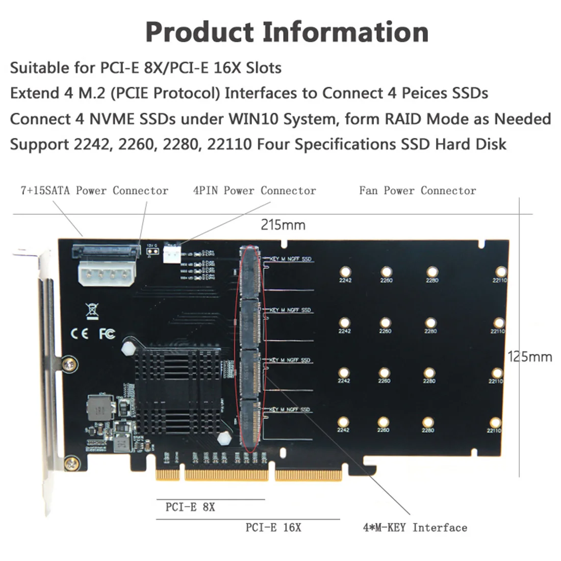 XT-XINTE 215*125 мм адаптер PCI-E карта LM313 PCI-E 8X/16X до 4P M.2 (PCIe протокола) для NVME переходная карта для 2242 2260 2280 22110 SSD