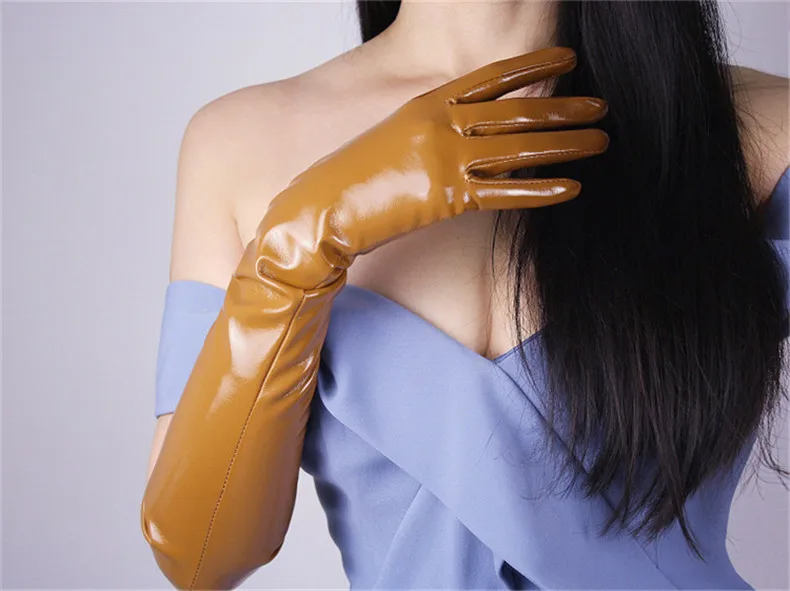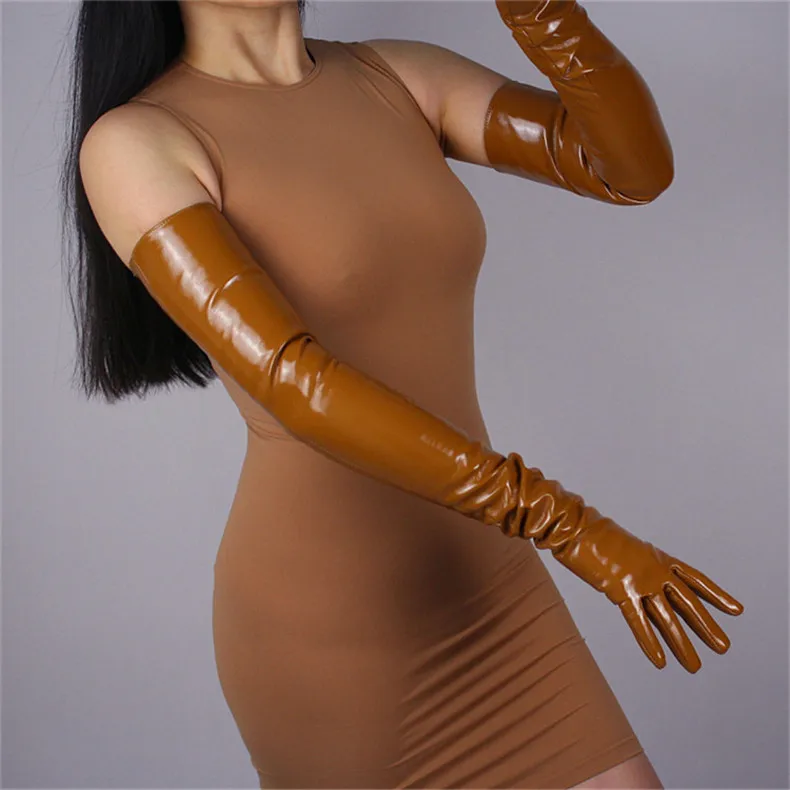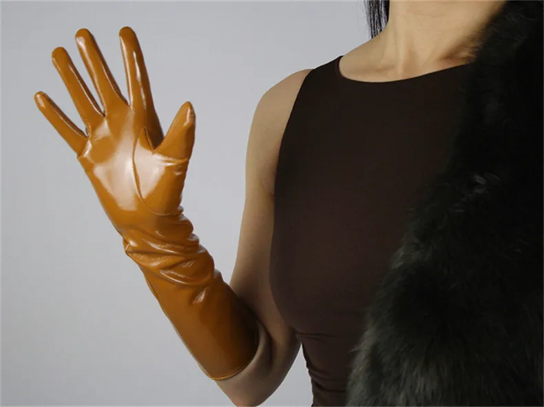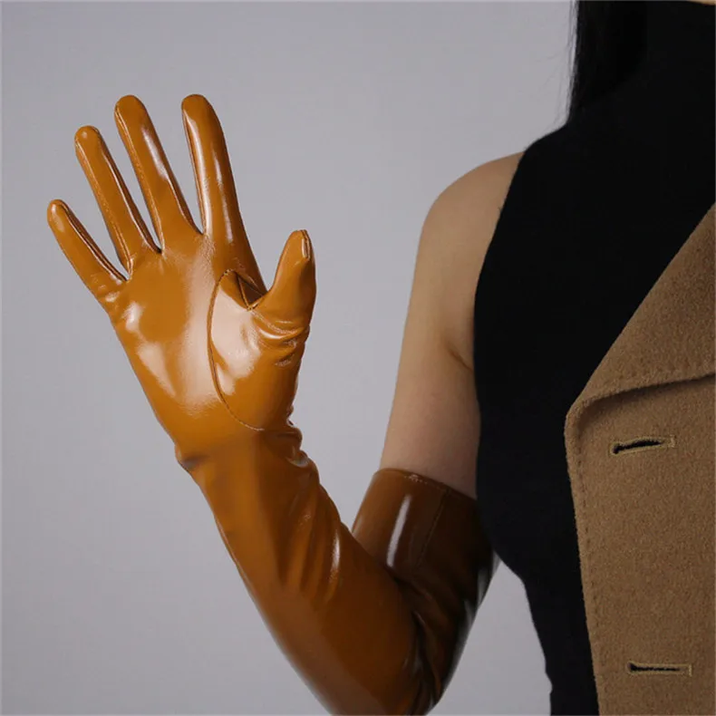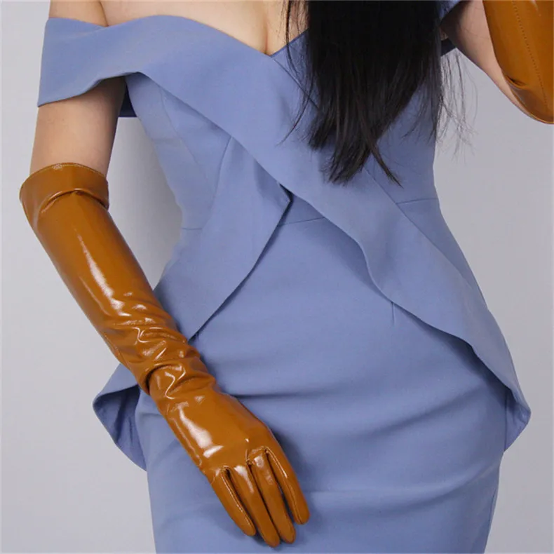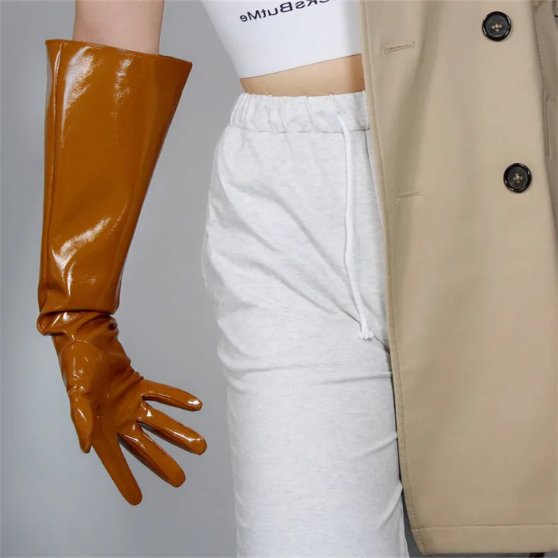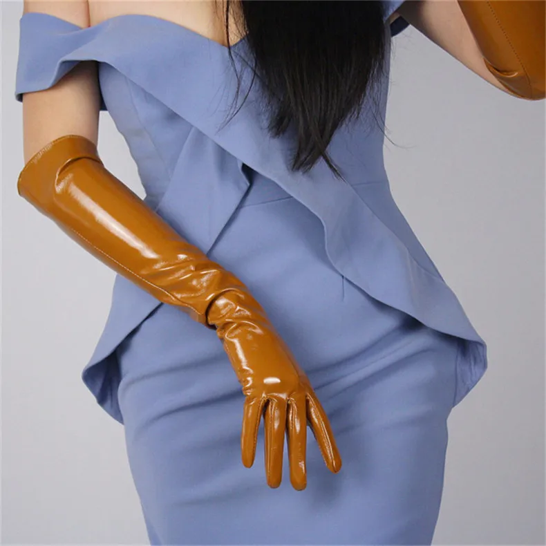 Длинные перчатки из лакированной кожи, 50 см, длинные, эмуляционные, яркие, глянцевые, зеркальные, яркие, коричневые, карамельные, WPU85