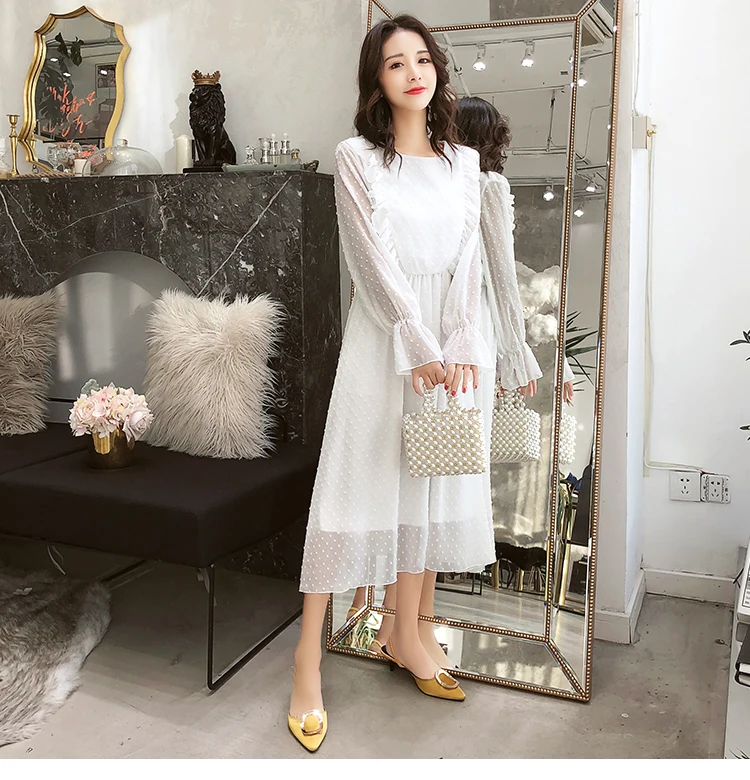 Весенне-осеннее милое белое платье в горошек, новые корейские модные женские длинные шифоновые платья с длинным рукавом, S-XL