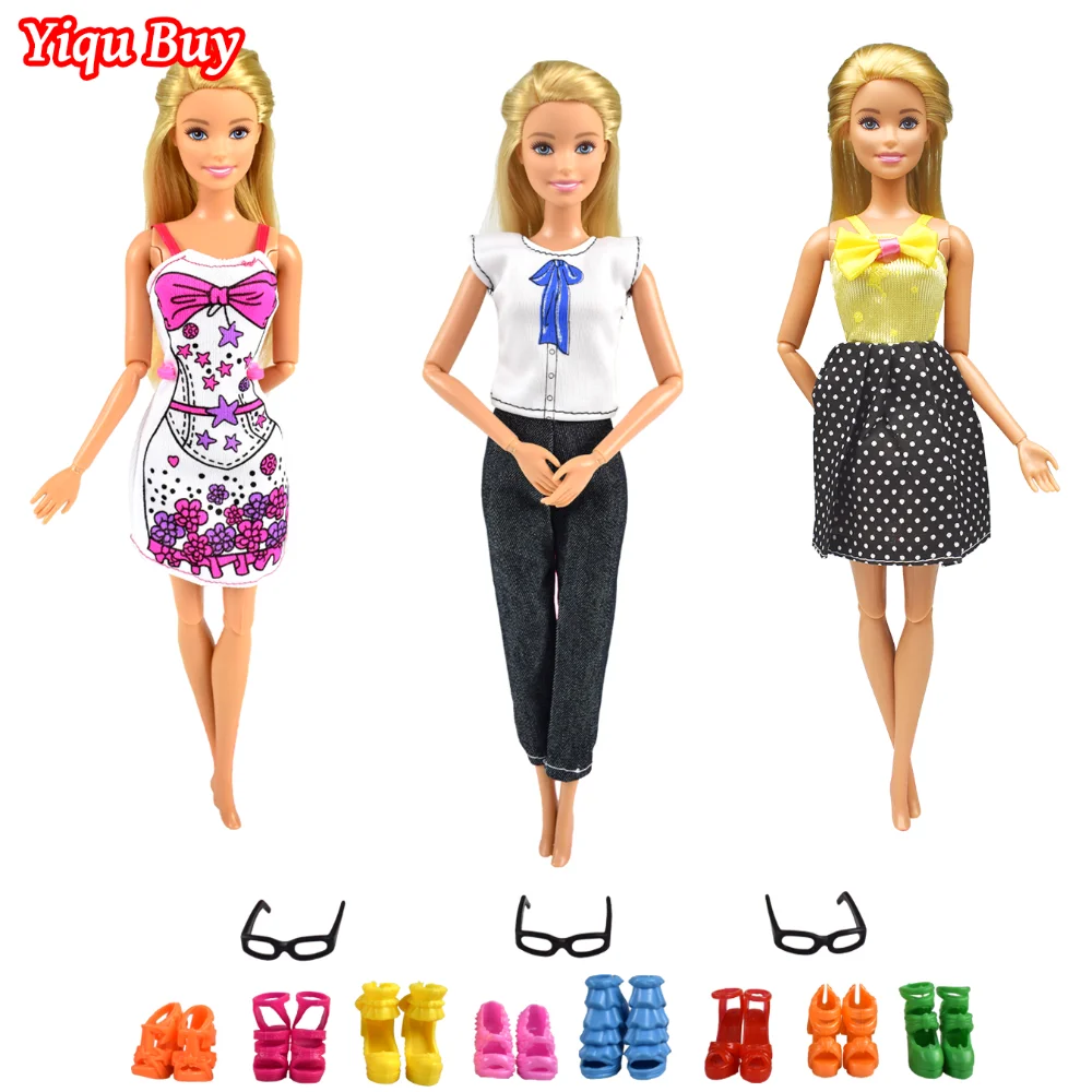 Посылка включает:3 шт. кукольная одежда + 3Очки+Случайный3.Пара обуви