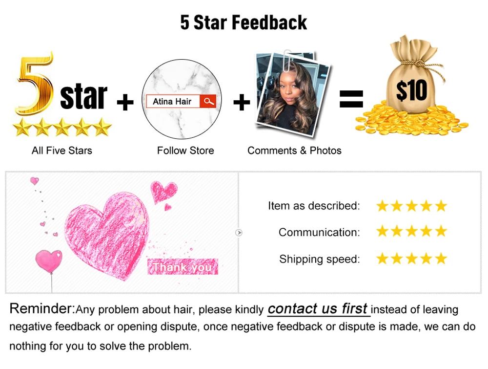 1. Физический адрес необходим, не оставляйте адрес PO BOX (FPO), так как DHL/TNT /fedex не могут доставить его. 2. Не разрешайте DHL/TNT /fedex оставлять посылка на вашей двери при любых обстоятельствах. Atina не будет возвращать или повторно отправлять волосы за посылка, которая была потеряна, доставлена по правильному адресу, но не подписана вами иногда 3. Поскольку Aliexpress требуется 6-24 часа для проверки оплаты, мы отправим волосы. Доставка занимает 3-7 рабочих дней. 4. Если вам нужна небольшая Кепка, пожалуйста, свяжитесь с нами