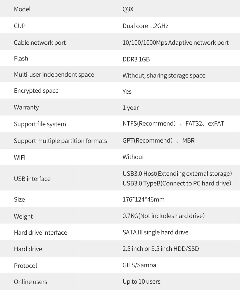 -Поддержка 2,5 дюймов и 3,5 дюймов HDD и SSD, максимальная Поддержка 8T Материал: цинковый сплав + АБС-пластик продукт Размеры: L176 * W124 * H46.5mm Pracking Размеры: L225 * W190 * H75mm продукта Вес: 0,7 кг упаковка Вес: 1 кг