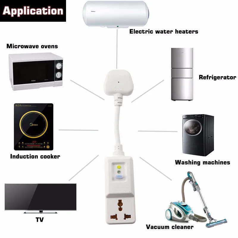 Он широко используется для защиты от утечки для электрического водонагревателя, микроволновой печи, индукционной плиты, телевизора, холодильника, стиральной машины, сушилки для волос, электрического утюга, пылесборника, электрического водяного насоса, электрической косилки и т. д.