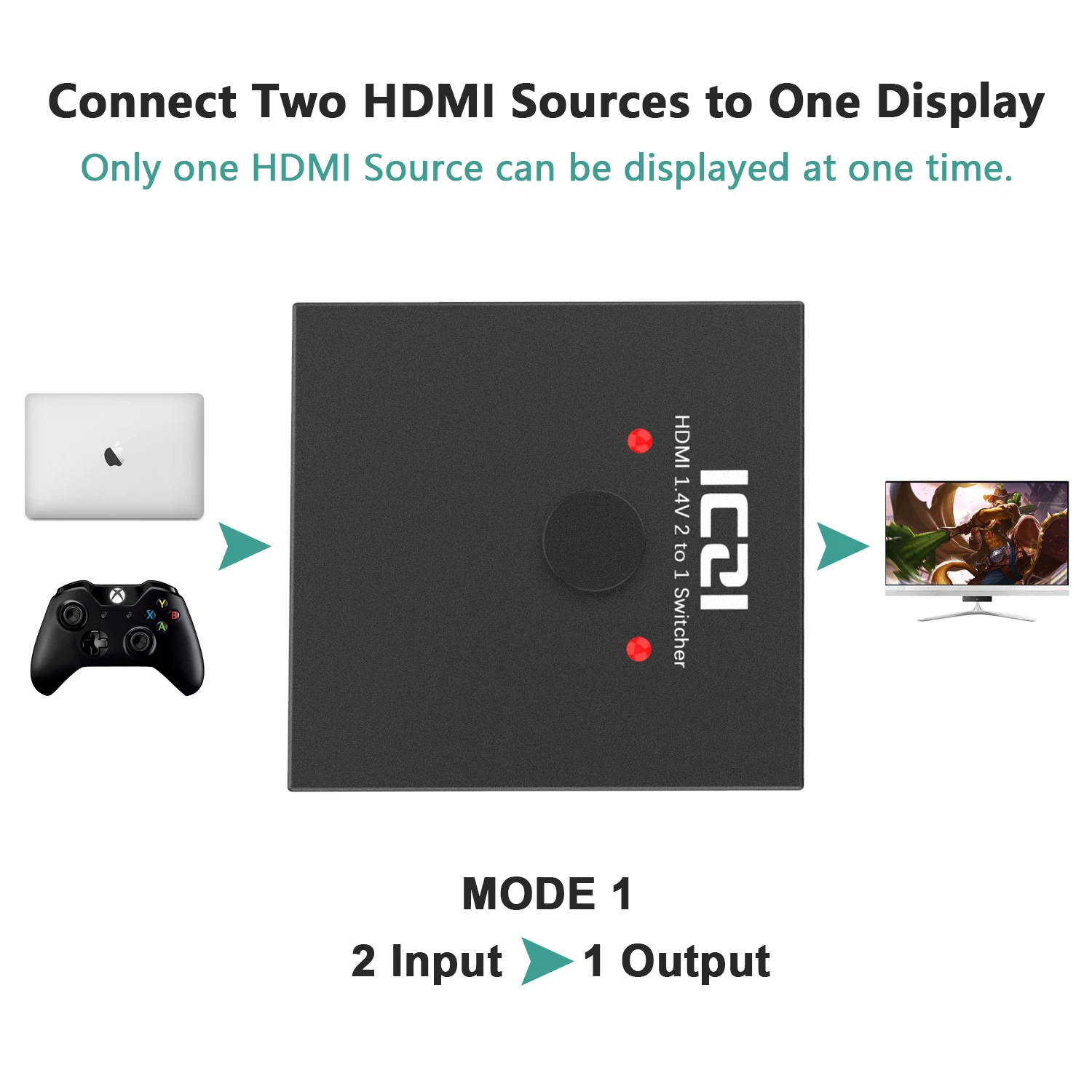 1. Поддержка 3D, 4 K * 2 K разрешение. 2. Два режима: Режим 1: Подключите два источника HDMI к одному дисплею, только один источник HDMI может быть отображен одновременно. Режим 2: Подключите один источник HDMI к двум дисплеям, два дисплея не могут быть показаны Одновременно