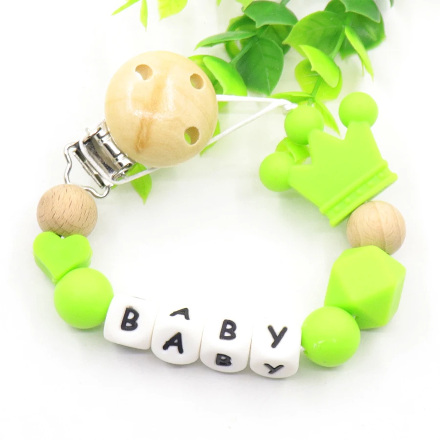 Персонализированные с именем маленьких, наши соски будут уникальным, прекрасным подарком. Каждая цепочка-пустышка изготовлена вручную, чтобы обеспечить максимально высокое качество. Наш дизайн имеет один деревянный держатель и различные отличительные пищевые силиконовые бусины, что делает модную и безопасное прорезывание зубов игрушкой для маленьких детей. Кроме того, наши фиктивные цепи легко для ребенка, чтобы хватать и жевать.