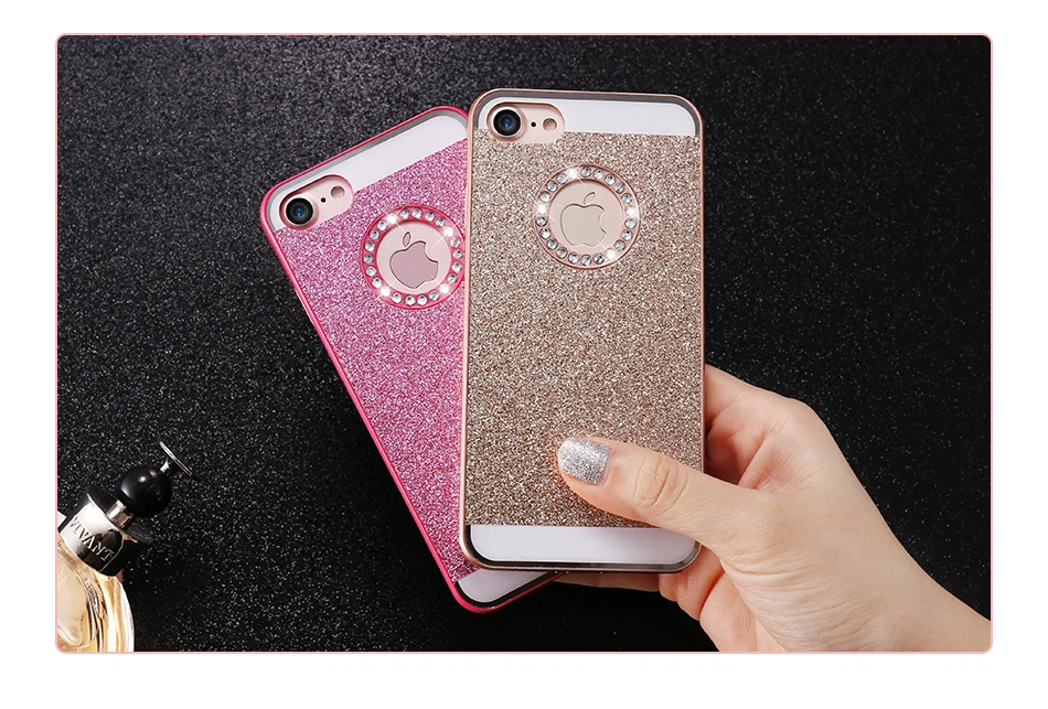 Пункты продажи> [Название]: для iPhone 7, 7plus 6 6s плюс 5 5S SE 4 4S чехол для телефона, Capa Coque [Особенность 1]: Блестящий горный хрусталь алмаз + логотип отверстие Футляр для телефона [Особенность 2]: твердый пластик + блестящий порошок Модный женский Чехол для мобильного телефона