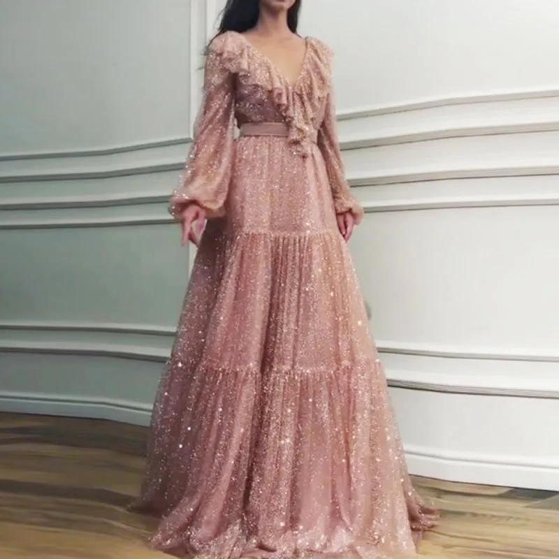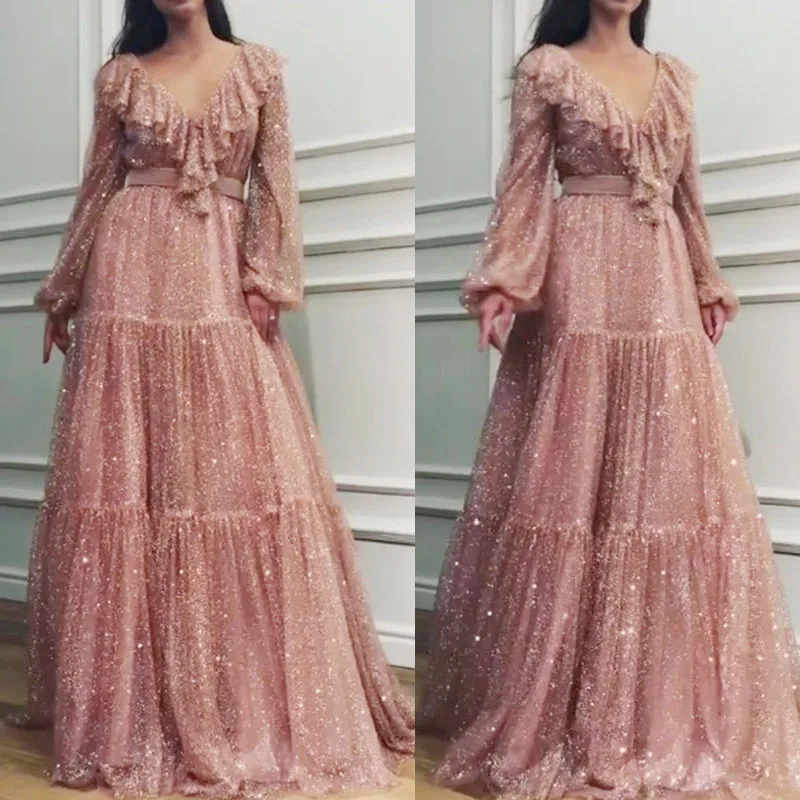 * Описание товара: женское блестящее сексуальное платье с v-образным вырезом и рукавами-колокольчиками; вечернее длинное платье
