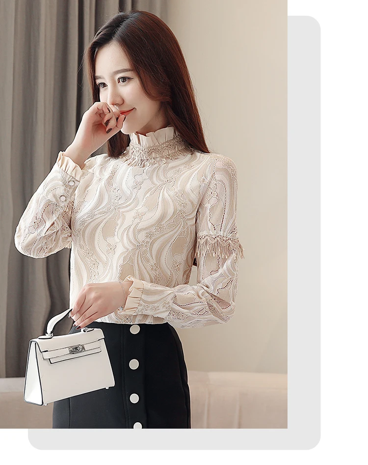 Женские кружевные блузки с высоким воротником, топы, женская рубашка с длинными рукавами, топы с оборками на пуговицах, большие размеры 3XL, элегантные блузы, офисная одежда