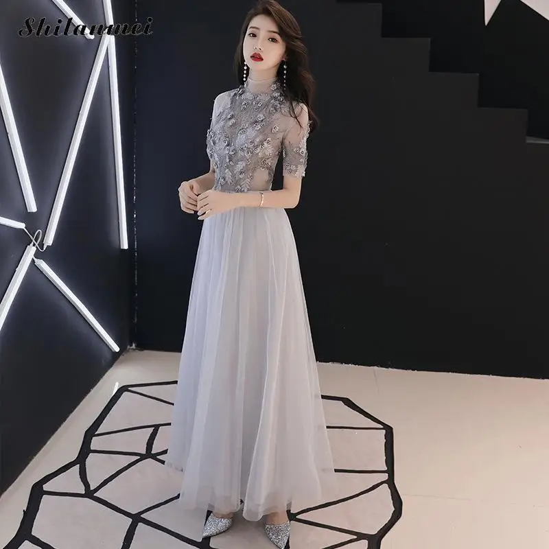 Летние шифоновые вечерние платья для женщин, сексуальное просвечивающее длинное блестящее платье, лоскутное Ретро серое Ночное Платье Vestidos De Fiesta
