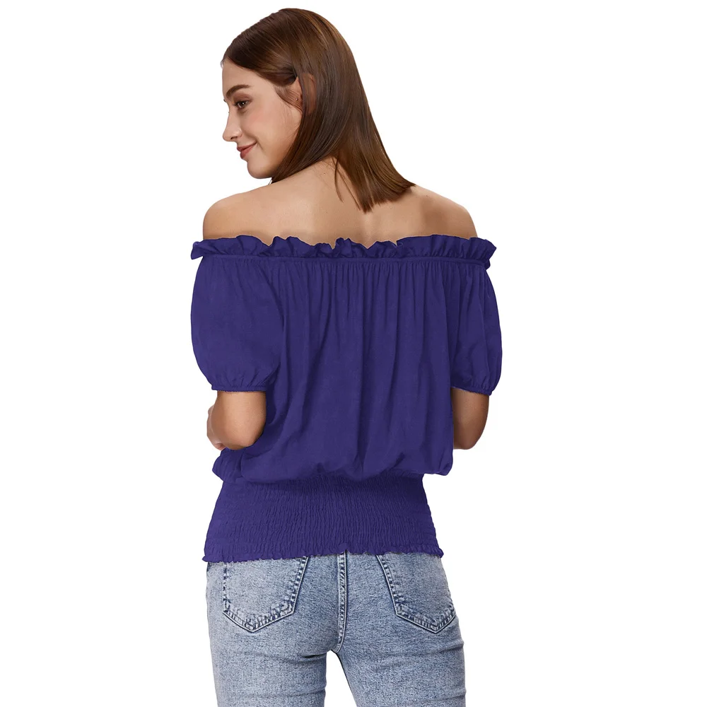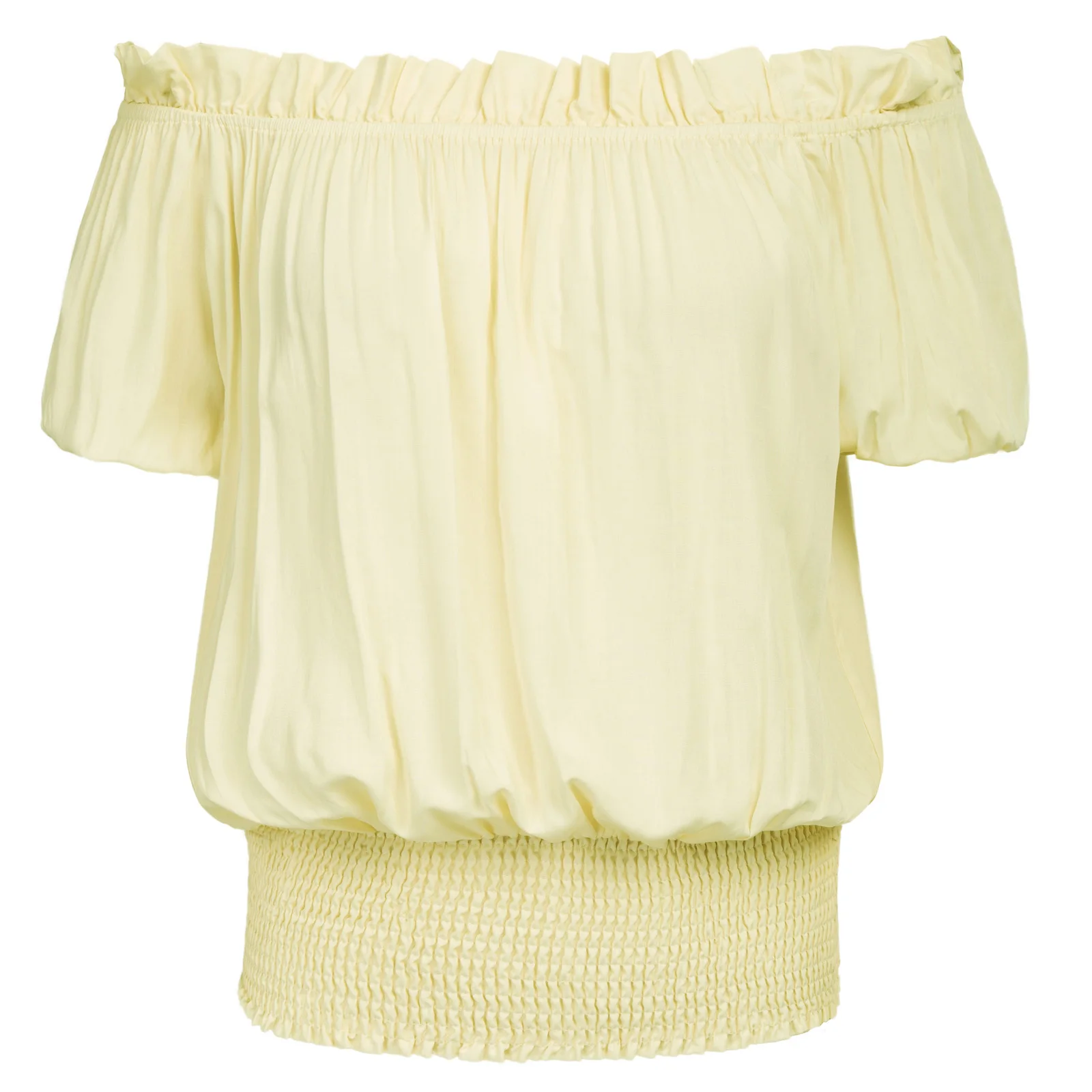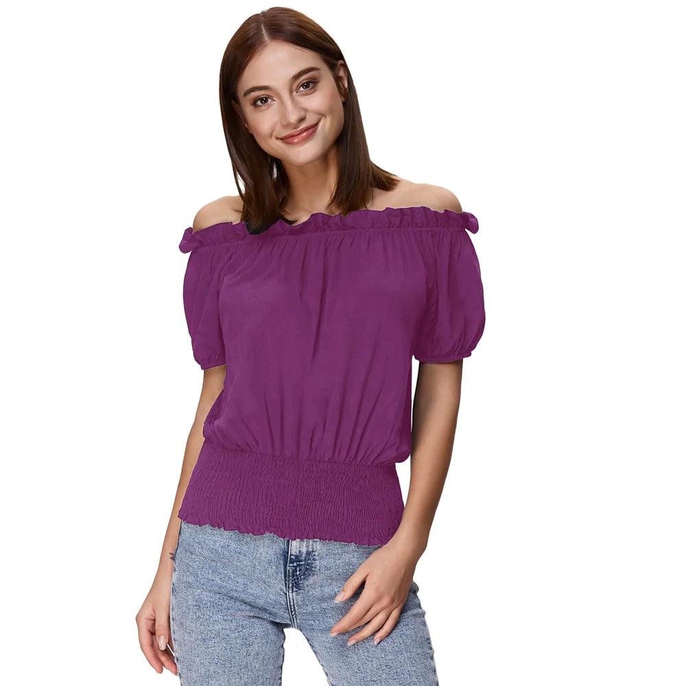 Особенности товара | 1)Короткий рукав с эластичными манжетами 2)Дизайн с открытыми плечами, также можно носить как топы с вырезом лодочкой 3)Вырез на резинке 4)Свободный крой 5)Мягкая и удобная ткань из вискозы 6)Со сборками на талии |