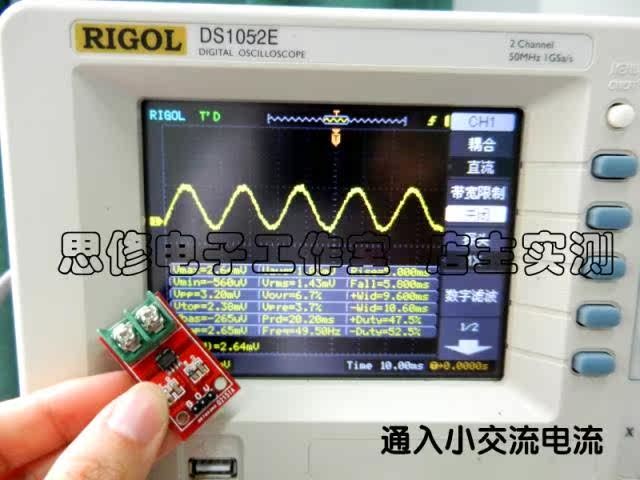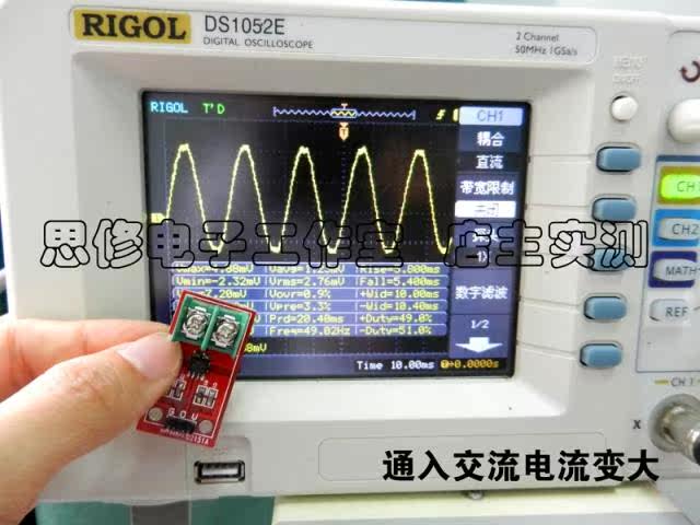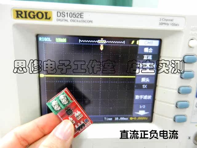 1. Чип датчика тока: ACS712ELC-20A;2. Pin 5 в источник питания, бортовой индикатор питания;3. Модуль может измерять положительный и отрицательный ток 20 ампер и выход 100 мВ/а, соответствующий аналогу.4. Когда ток не обнаружен, выходное напряжение VCC/2.Примечание: ACS712 основан на принципе обнаружения зала. Пожалуйста, старайтесь избегать влияния магнитного поля при его использовании.