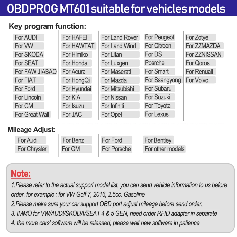 Чип EEPROM read: EEPROM ADAPTER V30.40 Иммобилайзер: для ACURA, для AUDI, для BAIC, для BESTURN, для BRILLIANE, для BYD, для CHANGAN, для CHANGHE, для CHERY, для CHRYSLER, для CITROEN, для DFLZ, для FPV, для DS, для FORD, для GEELY, для G-M, для GREATWALL, для HAFEI, для HAIMA, для HAWTAI Motor, для HONDA, для HONGQI, для HUAPU, для HYUNDAI, для INFINITI, для JAC, для JAGUAR, для KIA, для LANDROVER, для LEXUS, Для LIFAN, для LINCOLN, для LUFENG, для MAZDA, для MG, для MITSUBISHI, для NISSAN, для OPEL, для PEUGEOT, для PORSCHE, для RENAULT, для ROEWE, для SAIC ENGLANG, для сиденья, для SKODA, для SMART, для SSANGYONG, для SBARU, для SUZUKI, для TOYOTA, для VW, для YOUNGLOTUS, для ZZMAZDA, для ZZNISSAN; OBDII: OBDII V30.02 для диагностики Одометр через OBD: Для AUDI, для VW, для BENZ, для Chrysler, для Ford, для G-M, для Porsche, для Skoda, для Seat