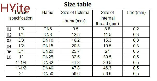 Женская резьба x размер мужской резьбы (около): M5/(5 мм) 1/8 "(9,7 мм) 1/4" (12,5 мм) 3/8 "(16,5 мм) 1/2"(20 мм) женский x мужской