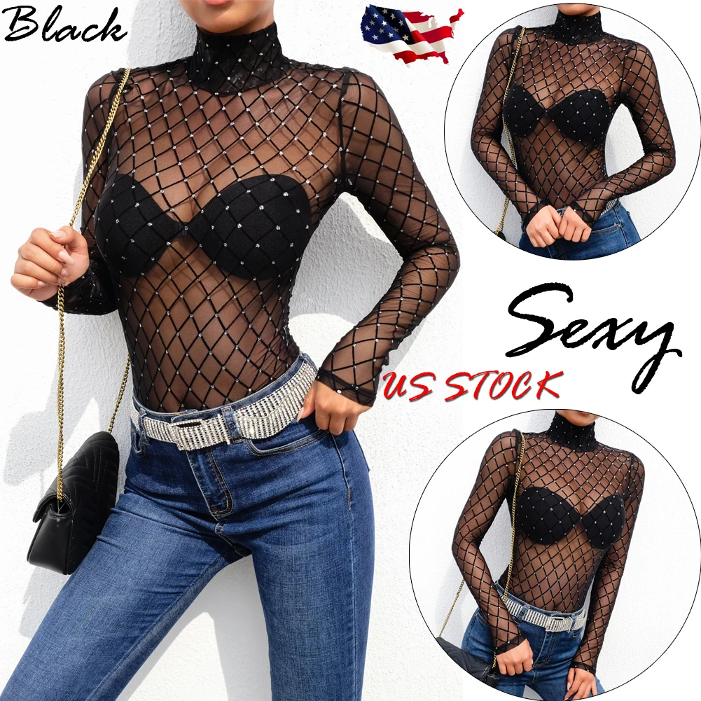 Женский сетчатый комбинезон черный прозрачный кружевной с длинным рукавом и