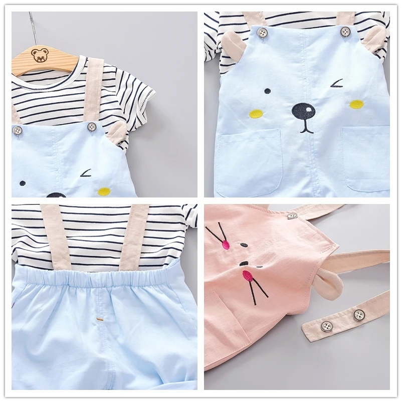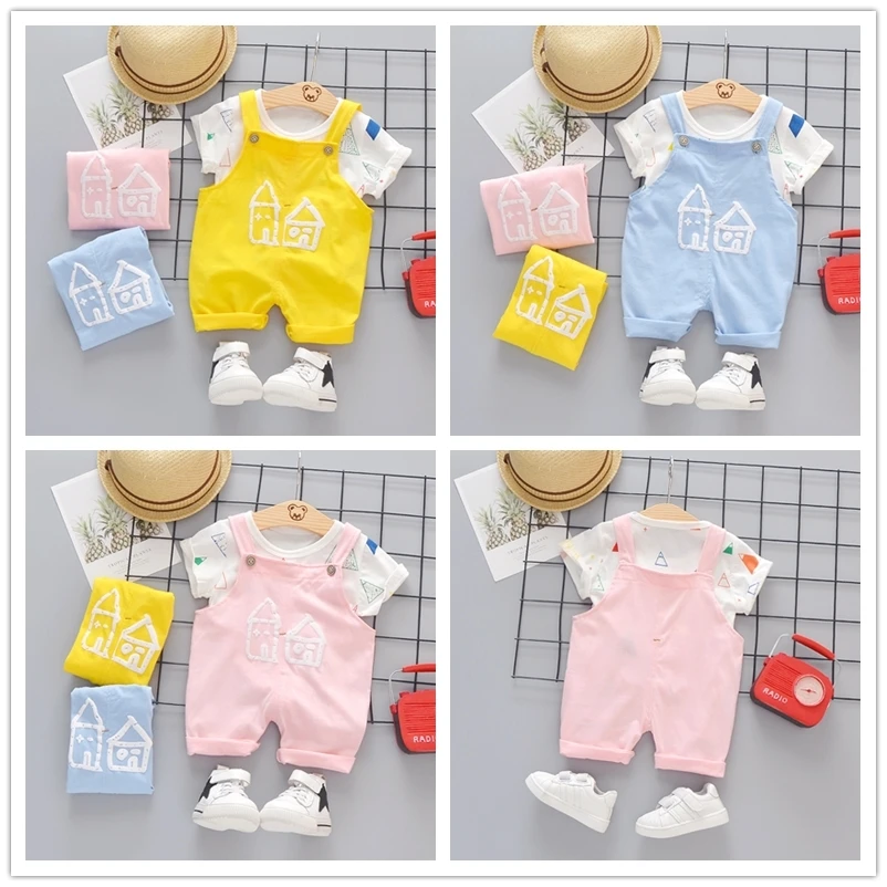 Летняя одежда для маленьких девочек и мальчиков повседневные модные костюмы для малышей футболка шорты на бретелях 2 шт./компл. Детский костюмДля 0-4 лет