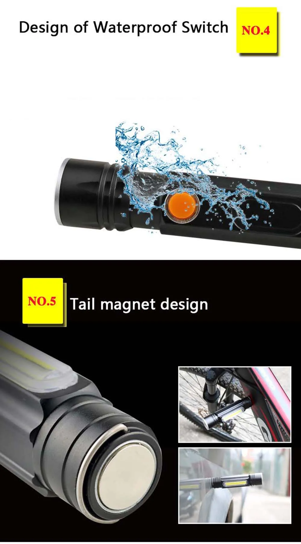 -Дизайн освещения COB sidelight. Он принимает 10 Вт мягкий источник света COB высокой яркости, который используется для ночной езды, аварийного отключения питания, кемпинга барбекю, ночного обслуживания, чтения и чтения. -Фары T6 блики лампы, 200-500 метров дальность, изменение точки может быть большим или маленьким; боковой свет COB, большой площади освещения, ночная работа и обучение более практичны. -Телескопическая конструкция фокусировки. Прожектор-прожектор. -Прорезиненная водонепроницаемая. -Дизайн хвостового магнита. Может адсорбироваться на железосодержащих предметах. -Прямая зарядка через USB. Его можно заряжать непосредственно на зарядном кладе, вилке мобильного телефона, компьютере, автомобильном зарядном устройстве, удобном и быстром, встроенном литиевом аккумуляторе. Индикатор красного цвета при зарядке и зеленого цвета при полном заряде. -Дизайн хвостового крючка. В случае, когда не может быть адсорбирован предмет, содержащий железо, крючок, прикрепленный к хвосту, можно повесить.