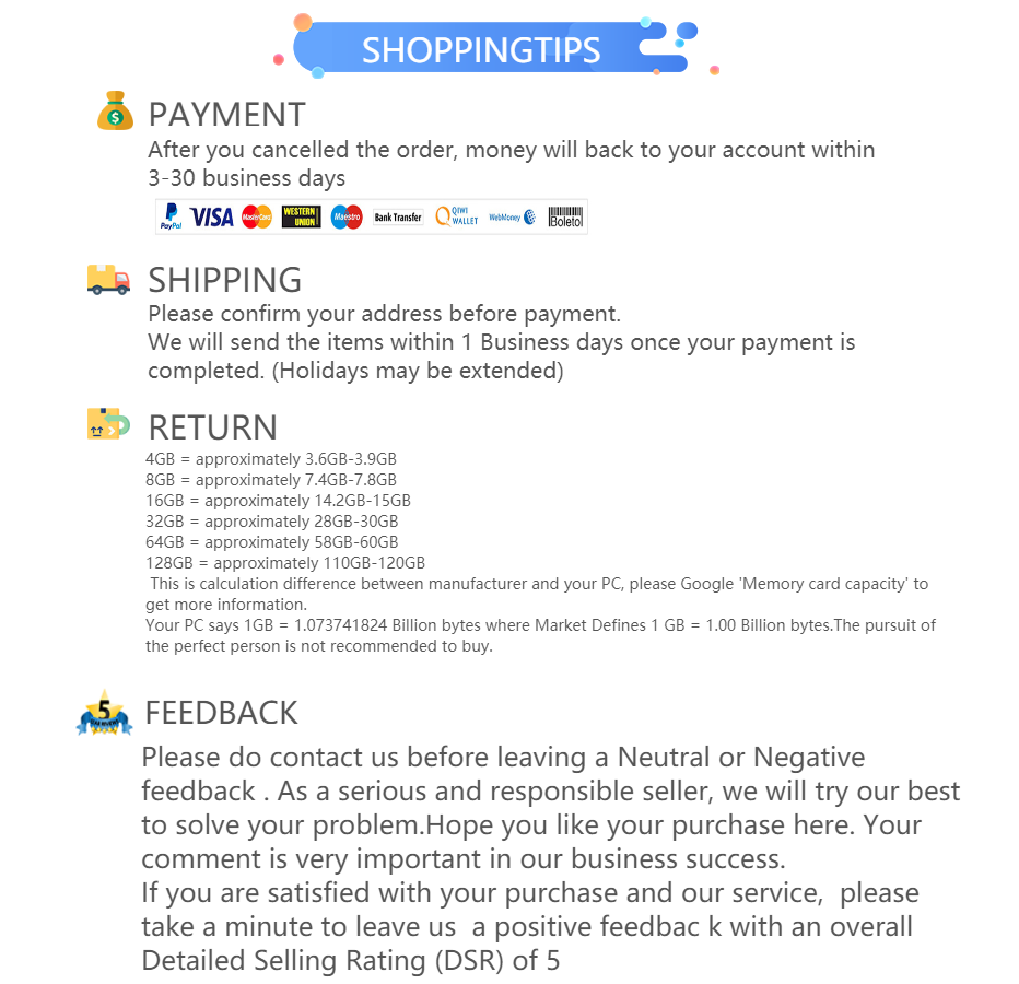Уважаемый клиент, в связи с наступающим китайским новым годом логистика прекратит все работы по доставке с 23-01-2017 до 03-02-2017, все заказы будут отложены после отправки праздников, пожалуйста, поймите! О реальной емкости 8 ГБ = примерно 7,4 ГБ-7,6 ГБ 16 ГБ = Приблизительно 14,5 ГБ-15 ГБ 32 Гб = приблизительно 28-30 Гб 64 ГБ = приблизительно 58-60 Гб 128 ГБ = Приблизительно 119-120 ГБ Это разница в расчетах между производителем и вашим ПК, пожалуйста, Google «емкость карты памяти», чтобы получить дополнительную информацию. На вашем ПК 1 Гб = 1,073741824 млрд байт Рынок принято определять 1 ГБ = 1,00 млрд байт.Стремление к совершенному человеку не рекомендуется покупать. Мы обещаем только продажу 100% реальная емкость, пройти H2testw.2. Все посылки являются авиапочтой.