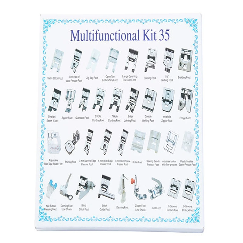 В общей сложности 35 шт. набор штампов: это многофункциональный набор штампов с 35 различными и обычными веревками или невидимыми молниями, ногами, облачными ногами, почти все ваши швейные иглы, включая все популярные шаги, края добавляют специальные ножки (проверьте, изображение или описание) в складки.