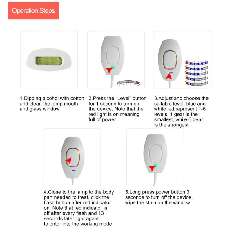 Эпилятор IPL подходит для удаления волос всего тела. Он использует Профессиональный интенсивный импульсный свет, чтобы точно нацелиться на меланин в волосяных фолликулах и обитает в росте волос, что обеспечивает постоянное удаление волос.