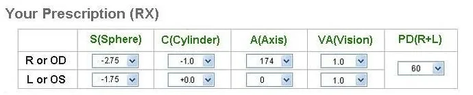 1.Diopter(S), 2. Pupil distance(PD), 3.Cylinder(C),4.Astigmatism(A)