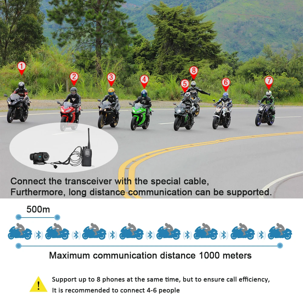 Функция внутренней связи этого Bluetooth Интерком поддерживает группу из 8 гонщиков максимум. Для обеспечения эффективности вызова рекомендуется подключить 4-6 человек. Когда вы входите в комнату внутренней связи, максимальный диапазон будет 1 километр. Конечно, этот максимальный диапазон работает, когда нет препятствий между элементами группы. Эффективный диапазон между двумя мотоциклами составляет около 500 метров (0,3 км).