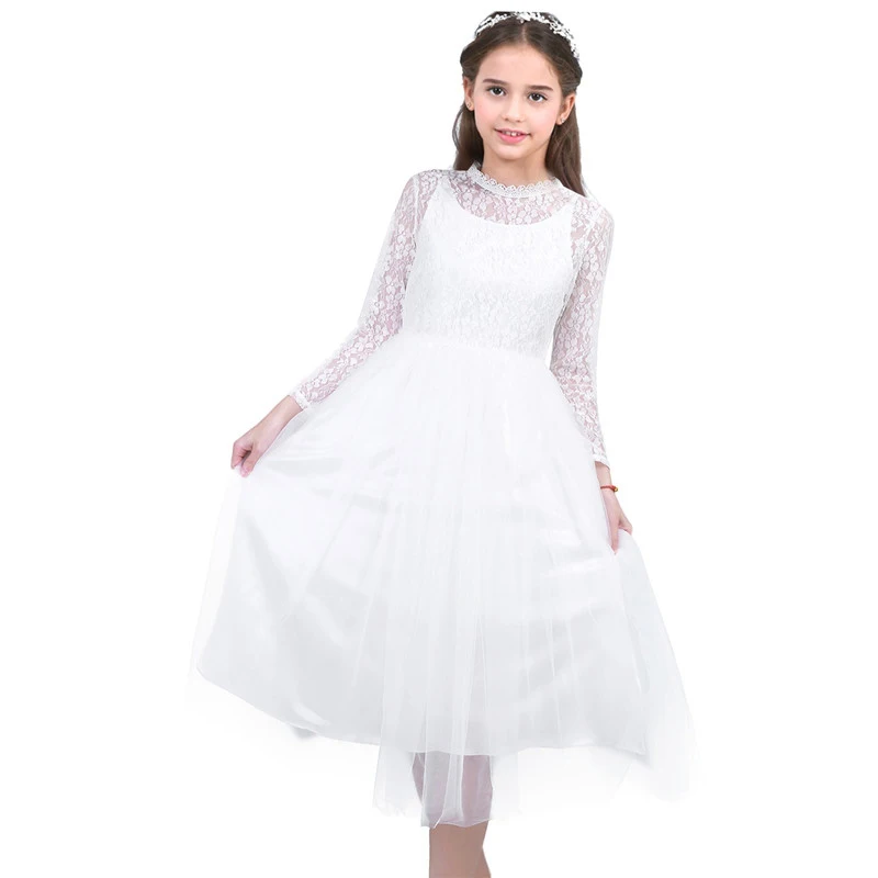 Платье с цветочным узором для девочек с длинными рукавами; Милое белое кружевное платье для свадьбы; Детское платье для выпускного вечера; Праздничное платье принцессы для первого причастия