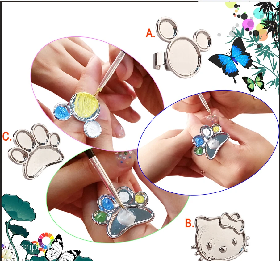 Стили: палитра из смолы (круглая, форма листьев, 10 видов стилей), палитра из нержавеющей стали (2 вида стилей, ноги, пять форм пальцев), пластиковая Палетка (цвета в случайном порядке!)