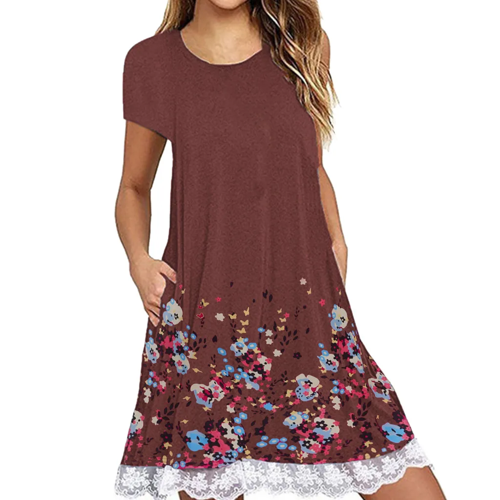 Женское повседневное кружевное мини-платье с круглым вырезом и карманом, короткие рукава, свободные вечерние платья