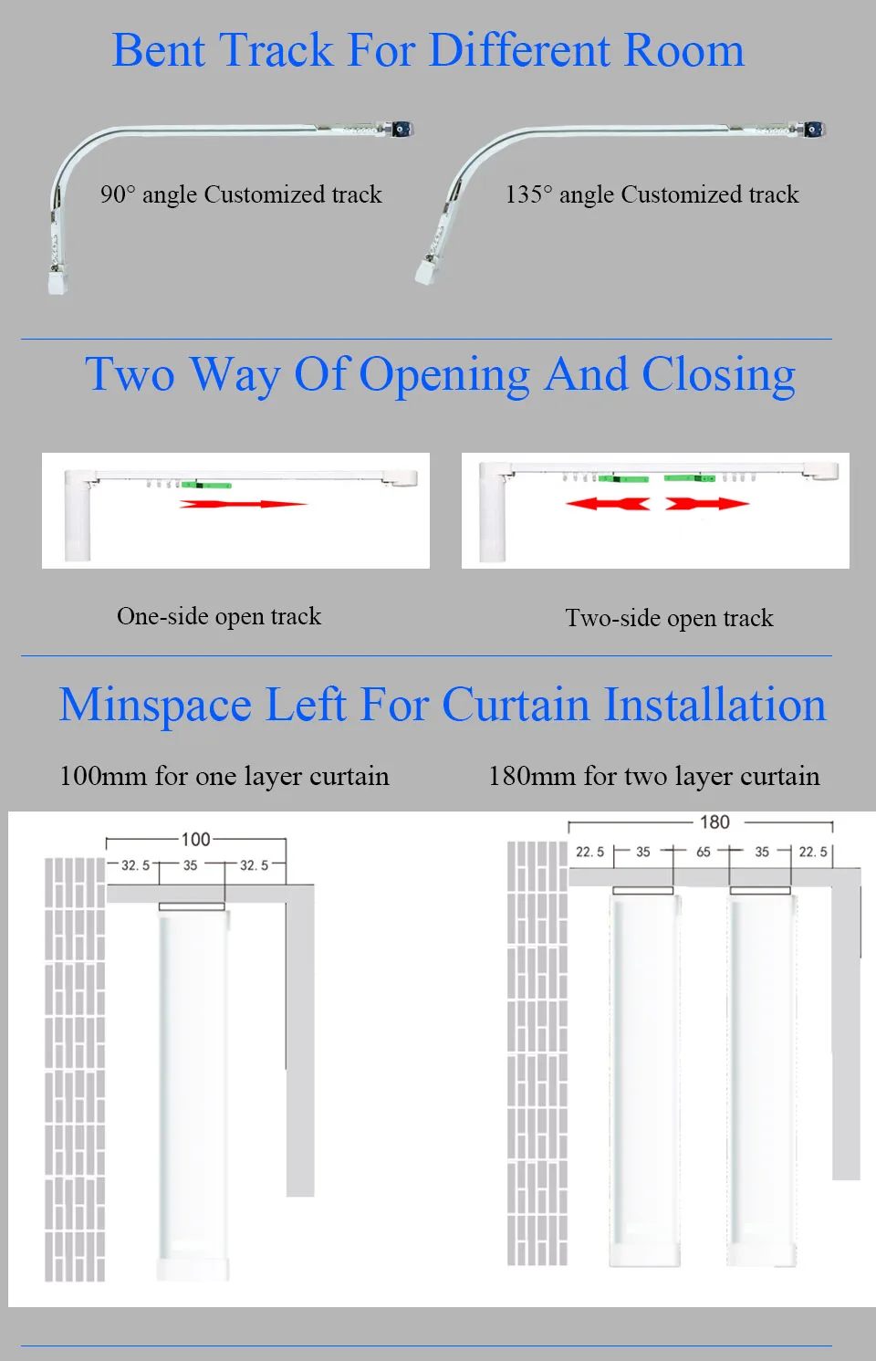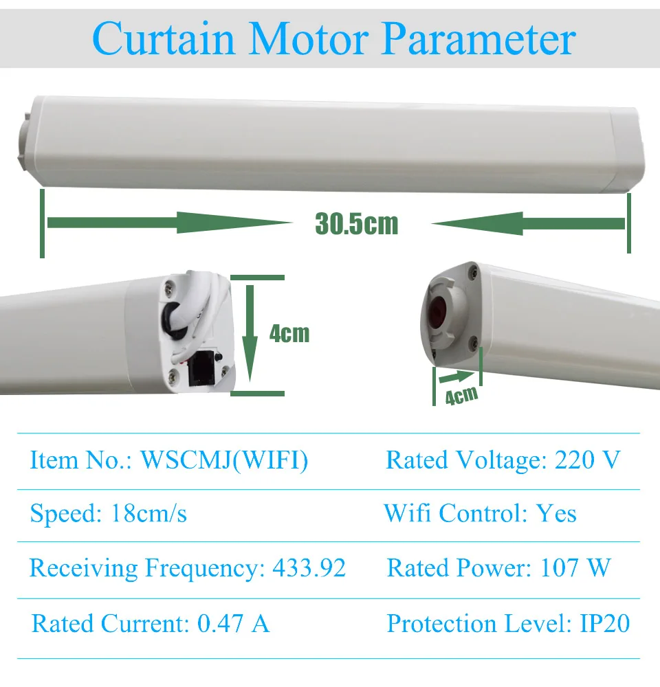 Комплект штор двигателя Номер товара: Номер мотора CM_CMJWIFI_TRACK1.2N Трек № CM_StraightTrack 1. Продукт включает: Карниз/Мотор/запчасти. В комплект не входит пульт ДУ, телефон или Tmall genie. Пожалуйста, свяжитесь с нами, если вам нужен пульт дистанционного управления. 2. Мин. И Макс. Размер: MOQ 1 метр в длине трека, если ваша длина меньше 1 метра, мы по-прежнему заряжаем на основе 1 метра. Максимум 5 метров в длину. Для длинных дорожек мы оставляем за собой право делать в 2-6 сегментах, чтобы соответствовать ограничениям размеров курьерской компании. Пожалуйста, свяжитесь с нами перед оформлением заказа. 3. Трек по умолчанию: Прямая дорожка с двусторонним открытым и потолочным креплением по умолчанию Если вам нужно одностороннее открытое или настенное крепление или U Тип/L тип/Z тип в 90 градусов или в 135 градусов, пожалуйста, сообщите нам. 4. Время гарантии двигателя: 3 года 5. Преимущества: Встроенный электромагнитный выключатель. Автоматическая Настройка пределов. Мягкий старт и мягкий стоп. Ручная работа во время Power-off.Touch контроля. 3-е промежуточное предельное положение.