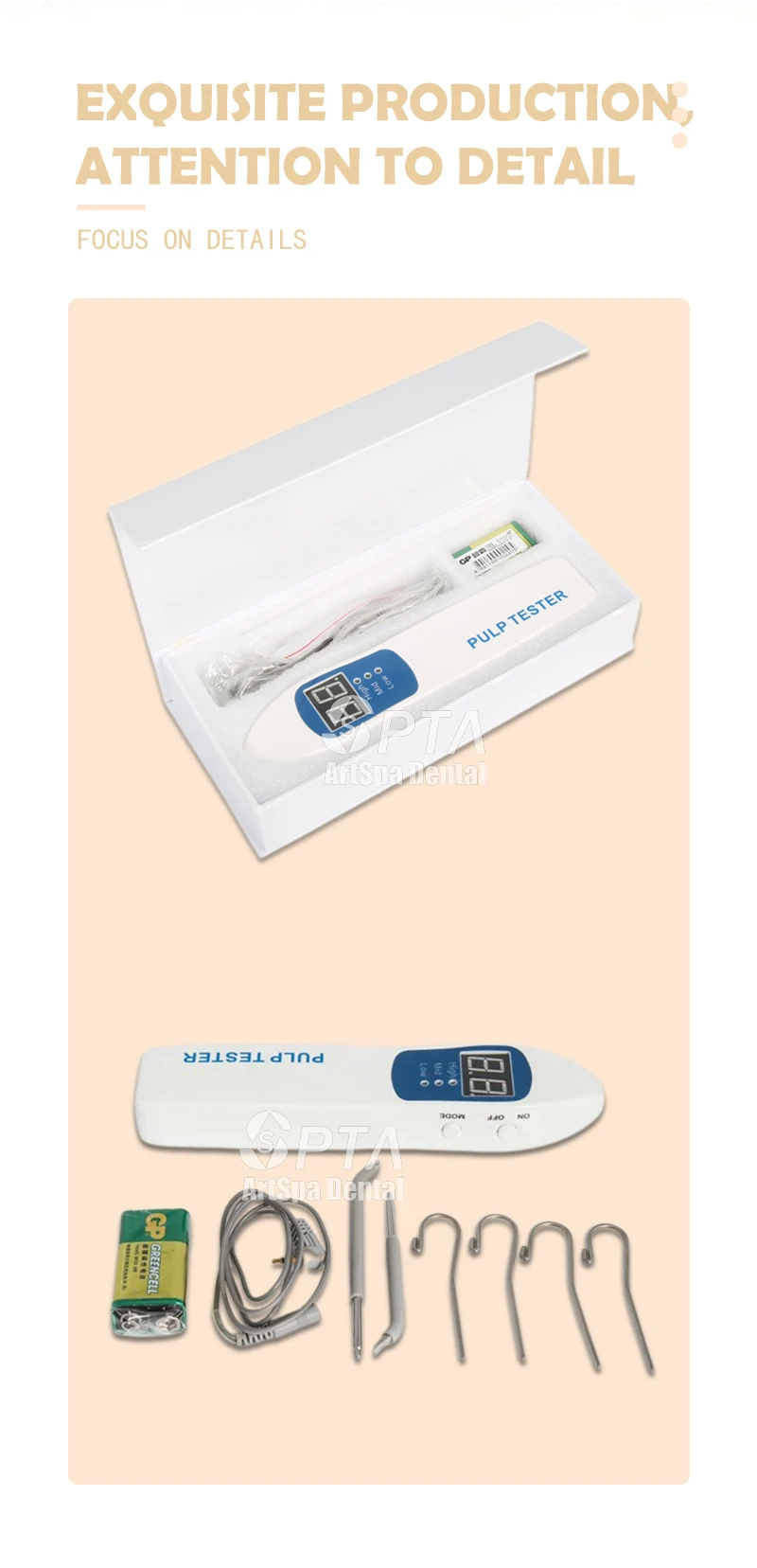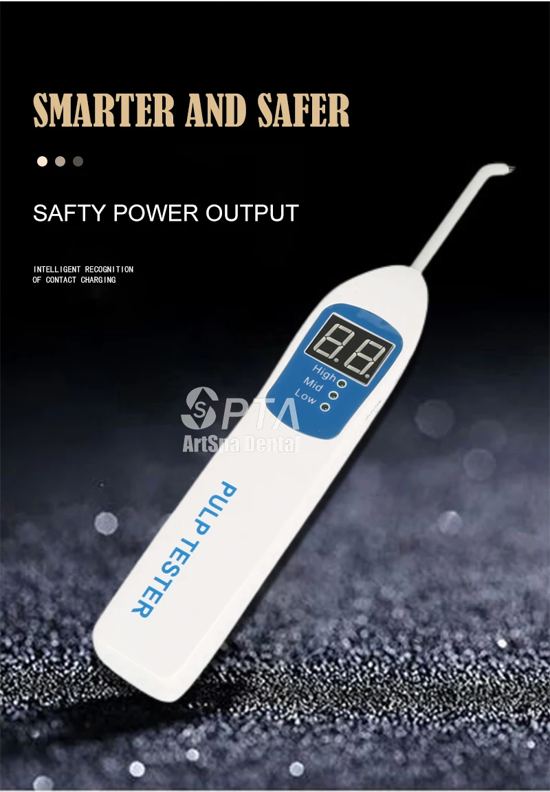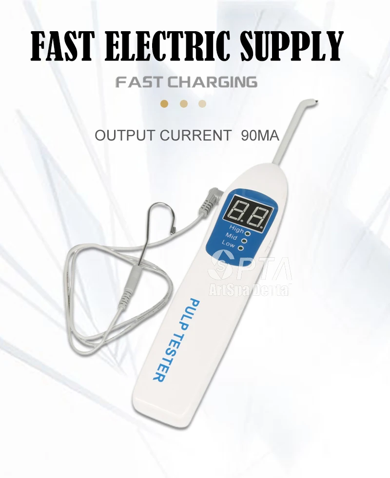 Применение. Этот элемент предназначен для проверки пульпы зубного нерва, делает Электрическую Стимуляцию зубного нерва, он может записывать реактивную ценность нерва, чтобы оценить жизненную активность нерва. Для оценки стоматолога очень необходимо проверить зубной нерв. Особенности: 1. Предустановленный режим скорости (высокая-средняя-низкая скорость) 2. Агент, импульсный стимул начинает увеличиваться со скоростью 3. Специально разработан для комфорта пациента 4. Если пациент указывает на восприятие, просто отпустите кнопку. Стимул сразу прекращается, но цифры остаются застывшими на лице около 3 минут 5. Удобный в эксплуатации максимальный стимул -- -80. Между 00-40 пациент чувствует боль и анестезию, живые зубы нервутся между 40-80, с вышеупомянутой реакцией, часть зубов нерв мертвых 80, нет вышеупомянутой реакции, мертвые зубы нерв 6. Прибор выключается сам через 3 минуты после работы (сохранить батарейки) 7. Работает от батареек, стандартные 9-вольтовые батареи, чрезвычайно Экономичные Характеристики: Вход: DC 9,0 в выход: 80 в (максимальный) ток: 90mAVOLTAGE диапазон: DC 6,0-10,0 в объем (см): 21*4*4 масса нетто: 0,35 кг Пакет включает: Основной блок X 1 Тестовый зонд 1 длинный и 1 короткий Тестовый провод X 3 Нержавеющий электрод X 4