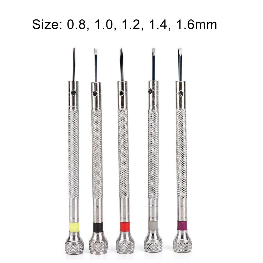 1. Including 5 flat head screwdrivers, the sizes are 0.8, 1.0, 1.2, 1.4, 1.6mm.