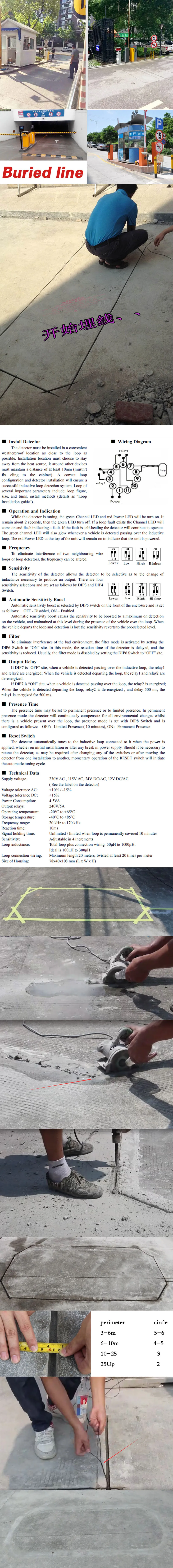 Фильтр Чтобы устранить помехи плохой среды, режим фильтра активируется, установив переключатель DIP6 на сайт «ON». В этом режиме время реакции детектора задерживается, и чувствительность снижена. Как правило, режим фильтра отключен, установив переключатель DIP6 на сайт «OFF». [Внимание] Если детектор не работает нормально, сначала необходимо проверить петлю и проводку, а затем изменить частоту или чувствительность. Наконец, попробуйте установить его в режим фильтрации. Выходное реле Если DIP7 находится вне площадки, то при обнаружении транспортного средства, проходящего через Индуктивный цикл, релей1 и релей2 заряжаются; Когда транспортное средство обнаруживается, покидающее петлю, relay1 и relay2 de-energized.If DIP7 "на" месте, когда транспортное средство обнаружено, проходя через петлю, Relay2 заряжен энергией; При обнаружении транспортного средства, покидающего петлю, relay2 разрядится и задерживает 500 мс, relay1 заряжен на 500 мс. Время присутствия Время присутствия может быть установлено для постоянного присутствия или для ограниченного присутствия. В режиме постоянного присутствия детектор будет непрерывно компенсировать все экологические изменения, в то время как на контуре присутствует транспортное средство, режим присутствия установлен с переключателем DIP8 и Настроено следующим образом: выключено: ограниченное присутствие (10 минут), включено: постоянное присутствие Переключатель сброса Детектор автоматически подключается к индуктивной петле, подключенной к нему при подаче питания, будь то при начальной установке или после какого-либо перерыва в питании. В случае необходимости ретрансляции детектора, что может потребоваться после изменения любого из выключателей или после перемещения детектора от одной установки к другой, мгновенная Работа переключателя сброса инициирует цикл автоматической настройки.