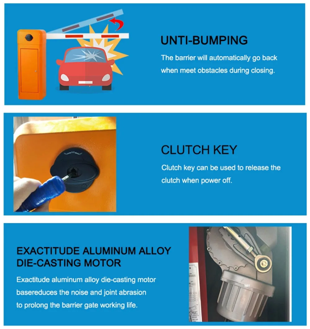 1. Скорость работы можно регулировать от 1.5s до 8 с 2. Можно быстро заменить 3. Откройте затвор шлагбаума моторным колесом при выключении питания, автоматически сбросится после включения питания 4. Изогнутая рукоятка с тремя звеньями, работа стабильна. 5. Беспроводной пульт дистанционного управления открытием/закрытием 6. Функция автоматического реверса (Регулировка силы) 7. Доступен разъем инфракрасных фотоэлементов 8. Коннектор детектора цикла доступен. 9. Хорошо интегрируется с оборудованием системы парковки автомобилей, с проводным управлением (должен быть сигнал переключения) 10. Разъем для светофорсветильник (220 В переменного тока, мощность менее 40 Вт) 11. Предлагаем сигнал сухого контакта для системы парковки автомобиля (COM,NC,NO) 12 Автоматическая задержка при закрытии (регулировка) 13. Интерфейс связи RS485 или CAN (не требует установки модуля) 14. Интерфейс подсчета Интерфейс резервного аккумулятора 15,24 в (можно заряжать с помощью солнечной энергии)