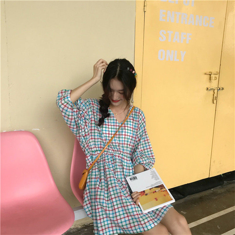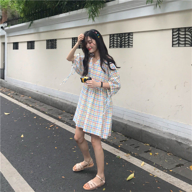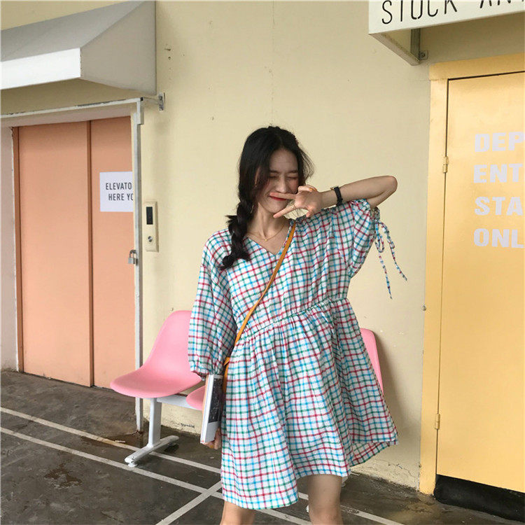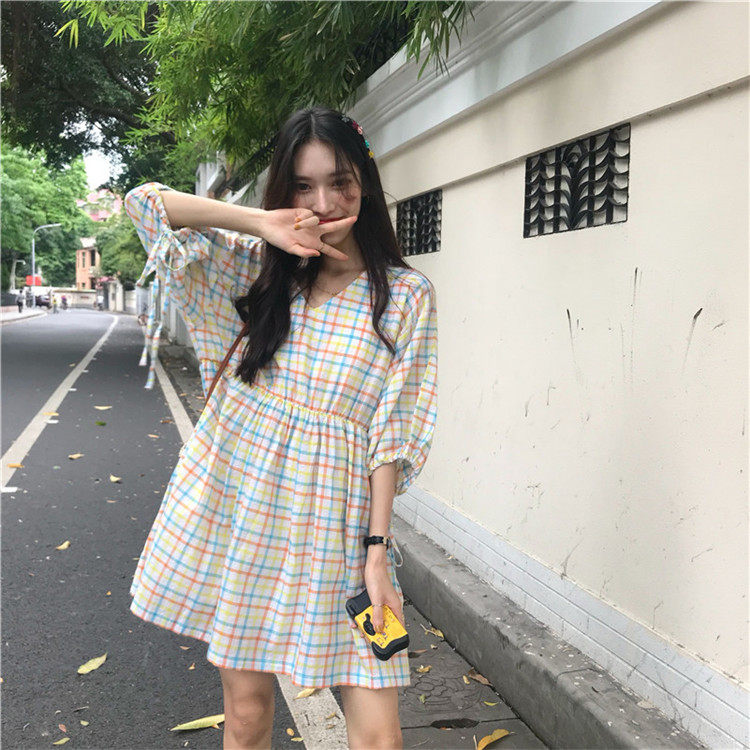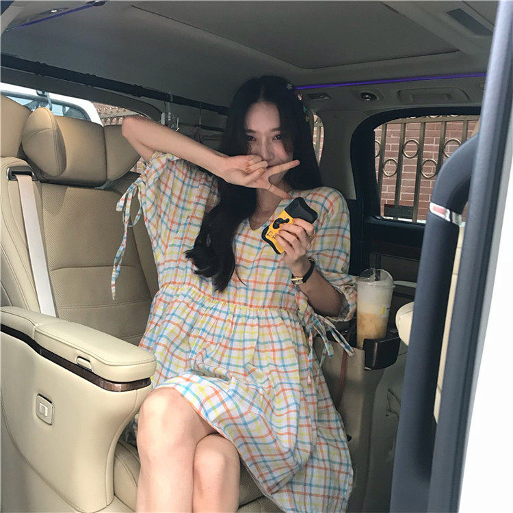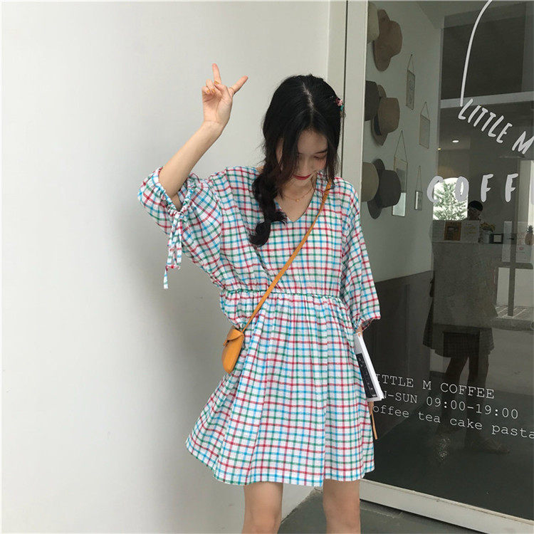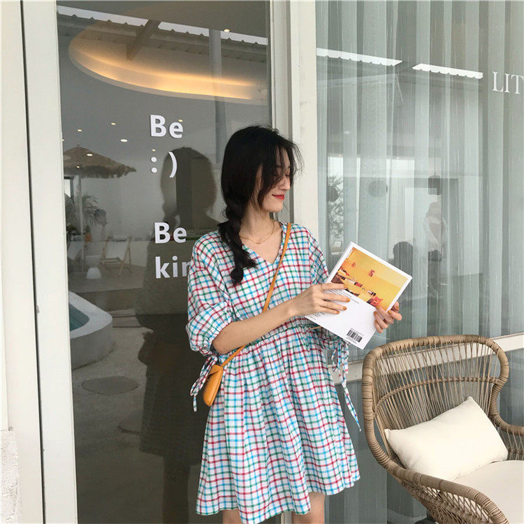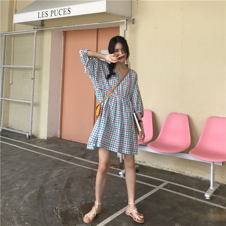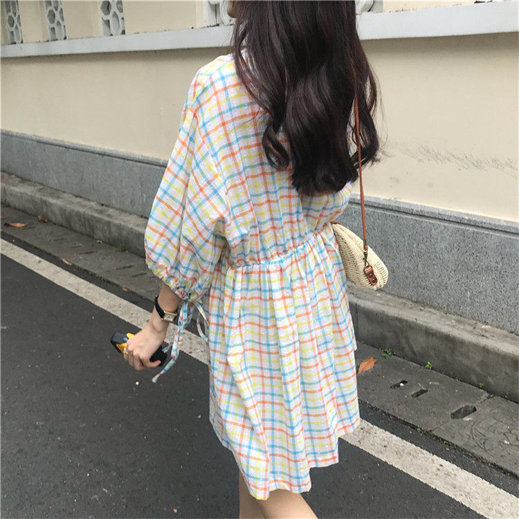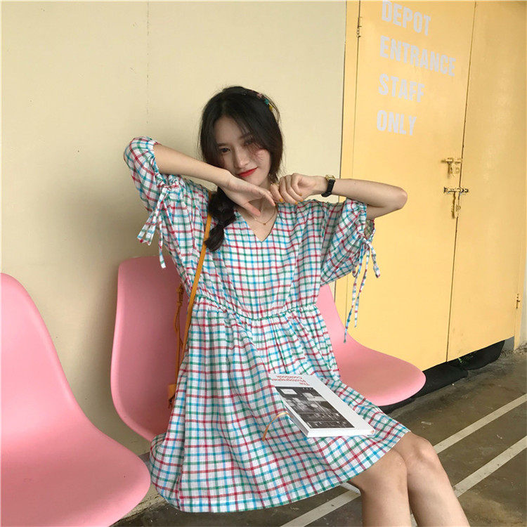 2 цвета, Летнее мини-платье 2019, корейский стиль, цветные клетчатые платья с коротким рукавом для женщин