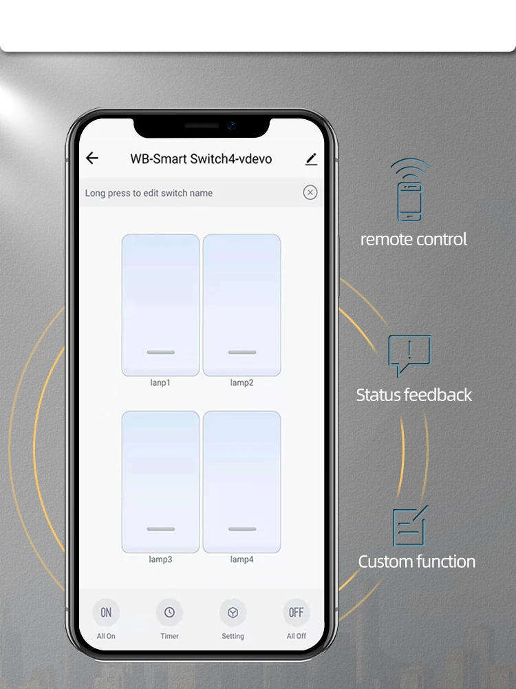 Название брендаNorklmesНомер моделиMKS-CM-W5ПроисхождениеКитайМатериалПластикТип товараПереключателиЭто умное устройствоYESХарактеристики1 2 3 4 GangСертификацияCQCГарантия1 yearСила тока3A/10AТип переключенияСенсорный выключательЕдиница измерения100000015Количество1Item TypeSwitchesPanel MaterialTempered Crystal Glass PanelMechanical Life100,000 Times of OperationUse ForLightingSwitch TypeTouch On/Off SwitchOperating Environment0℃~40℃; less than 95% RHFunctionWiFi Smart Light Touch Sensor SwitchSize86mm*86mm*34mmWireless StandardWiFi 2.4GHzVoltage(need neutral line)100V-240VVoltage(no need neutral line)220V