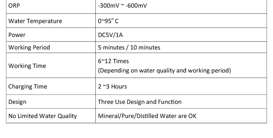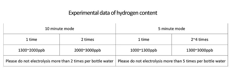 Супер-высокая концентрация: водород до 1000 ~ 1300ppb один раз (5 минутный режим) и 1000 ~ 2000ppb один раз (10 минутный режим), содержание водорода до 2000 ~ 3000ppb в течение 2 раз (10 минутный режим) или 4 раза (5 минутный режим). Пожалуйста, не должны превышать 2 раза (10 минутный режим) или 5 раз (5 минутный режим), потому что слишком большое давление воздуха может привести к авариям, таким как утечки.