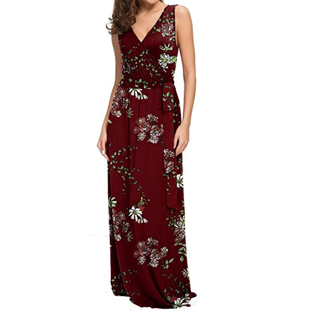 Женское летнее платье макси без рукавов с цветочным принтом и поясом, Повседневное платье