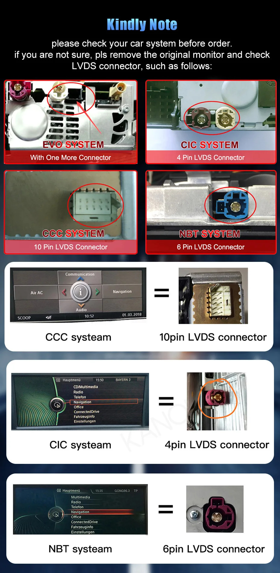 1. Какой год вашего автомобиля или отправьте нам одну фотографию LVDS порта за радио (CIC или CCC) 2. Если в вашем автомобиле нет AUX, пожалуйста, сообщите нам. Мы предоставим внешний радиопередатчик.