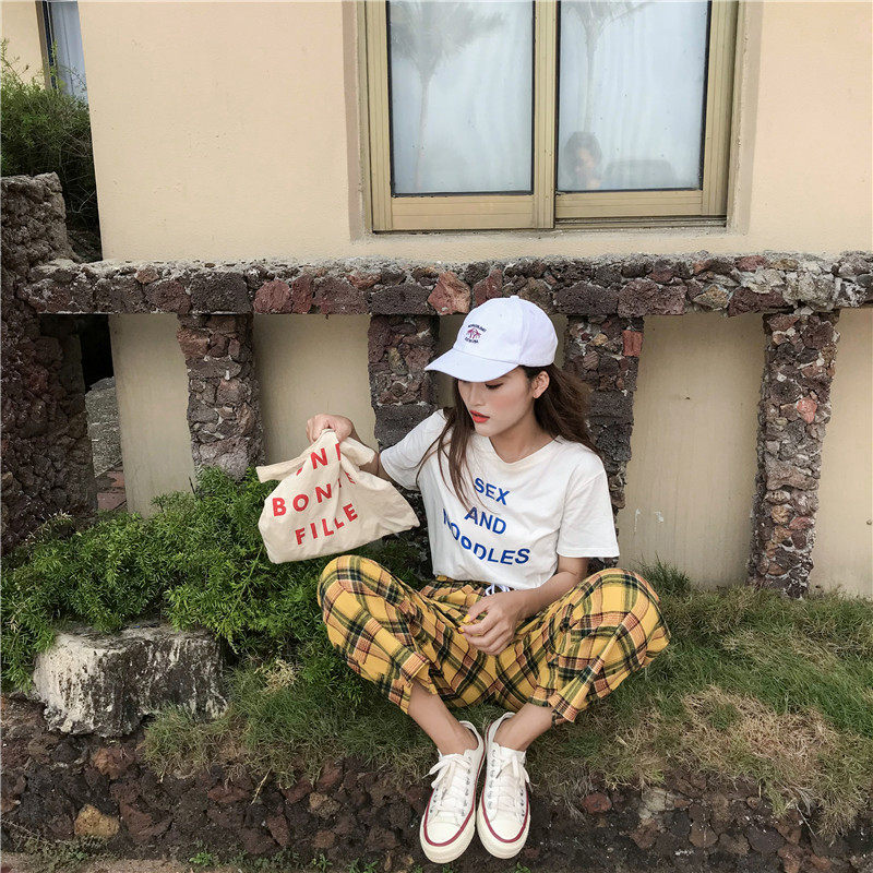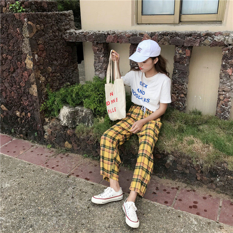 Женские свободные брюки PT177, желтые винтажные клетчатые брюки с широкими штанинами, на завязках, весна-лето 2019