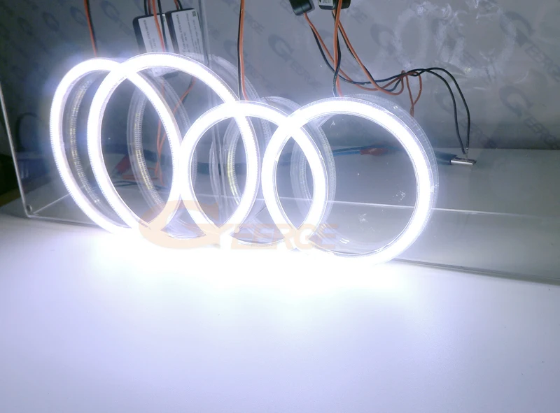 Этот набор включает в себя абсолютно новые, 4 шт набор ксеноновых холодных белых COB LED angel eye halo кольца, это хорошо для пользовательской модернизации фар.
