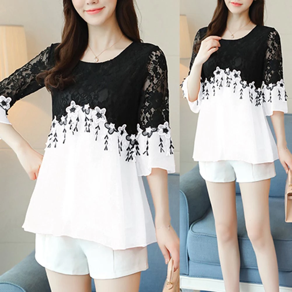 Плюс Размер Женская Цветочная вышивка кружева Лоскутная Ткань 3/4 с расклешенными рукавами Блузка Топ