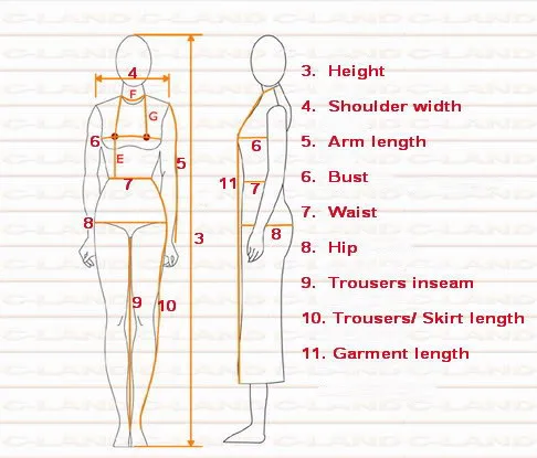 Если вы не можете найти свой размер в таблице размеров и хотите сделать его на заказ с вашими собственными измерениями, пожалуйста, предоставьте нам следующие измерения. Мы делаем подходящий костюм для вас.