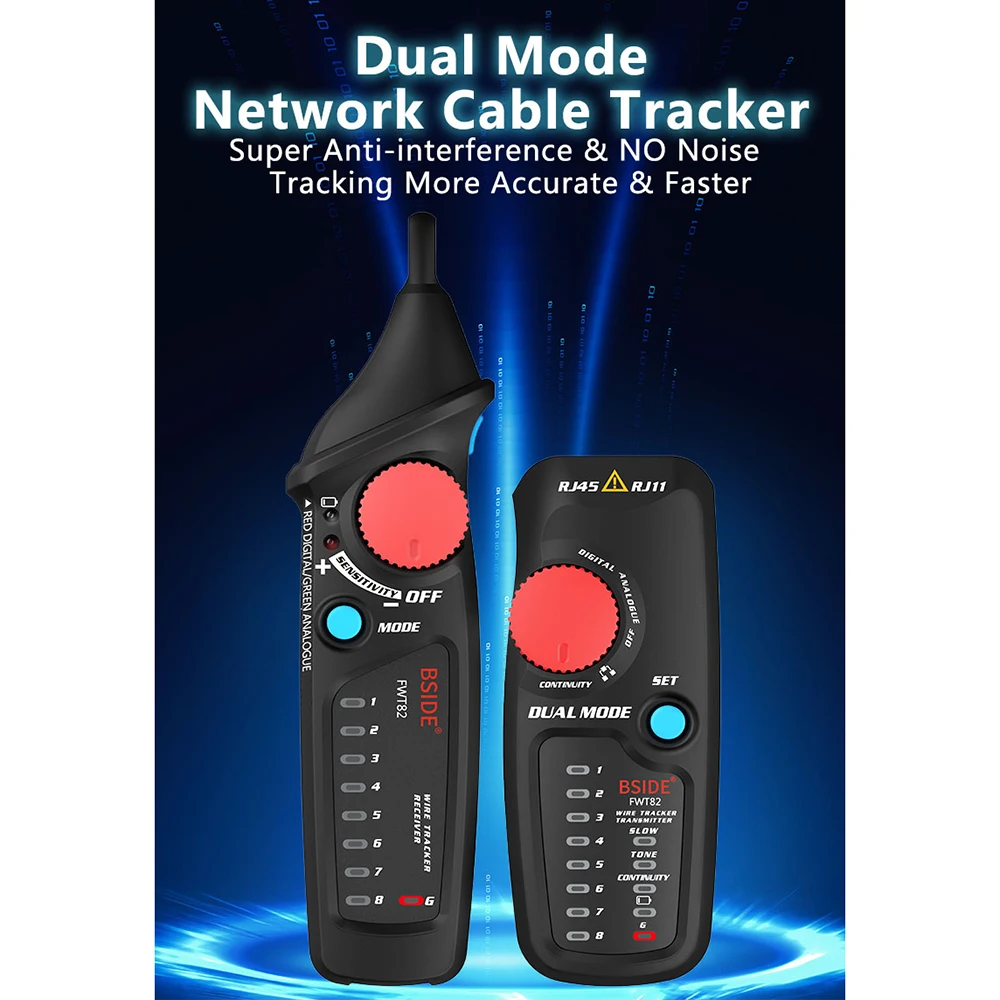 Этот проводный трекер имеет цифровой и аналоговый режим для выбора. Цифровой режим используется для поиска цифровых сигнальные кабели, таких как сетевые кабели на переключателях POE. Он не имеет помех и может четко определить место. Аналоговый режим используется для обнаружения аналоговых сигнальных линий, таких как телефонные линии, на большие расстояния. В то же время, аналоговое Обнаружение сигнала является более энергосберегающим, чем цифровое Обнаружение сигнала. Таким образом, двухрежимный FWT82 удовлетворяет потребности большинства пользователей в сетевой проводке и поиск линий.