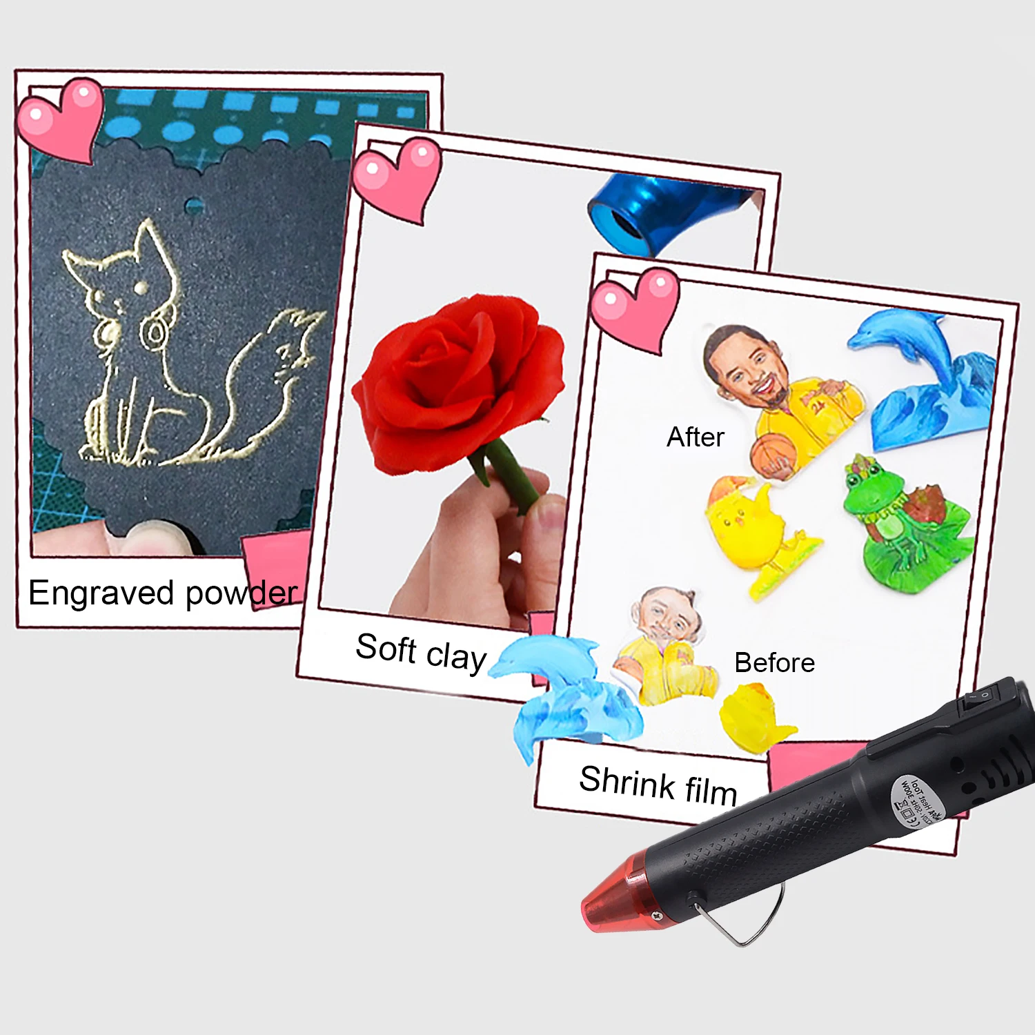 Мини-пистолет горячего воздуха используется для термоусадочной пленки, выгравированного порошка, резиновой прокладки или термоусадочной пластины, для завершения нагрева требуется всего пять секунд.