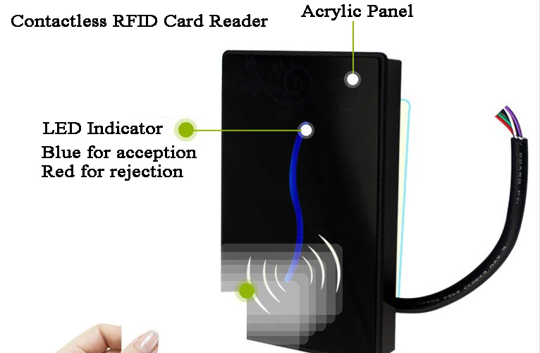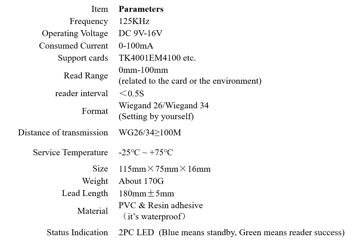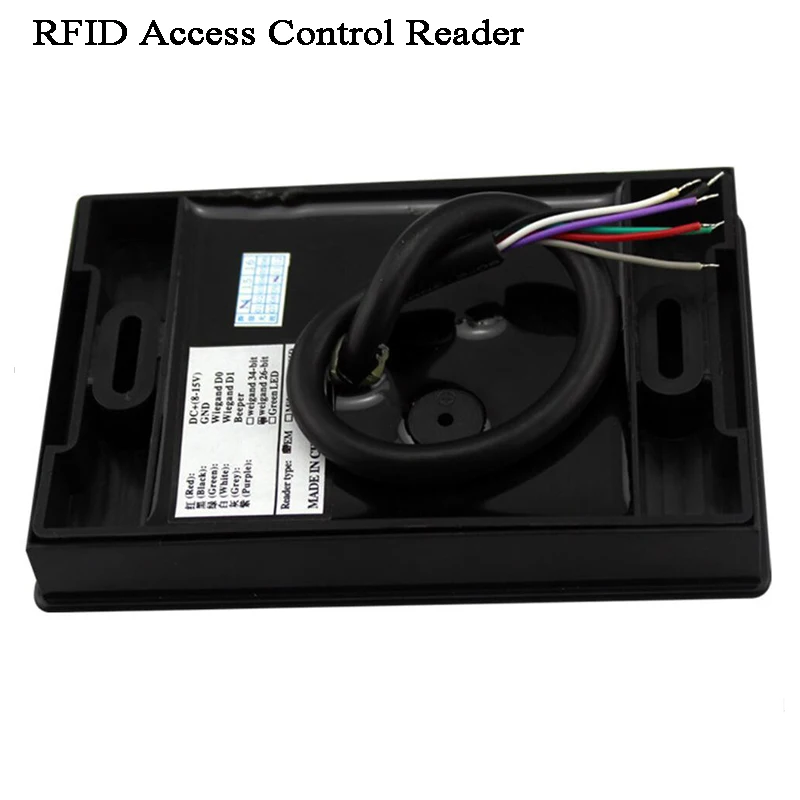 -Считыватель доступа IC/ID составляет 13,56 МГц/125 кГц бесконтактных M1 abacavir корневых головок, препятствует использованию усовершенствованной схемы радиочастотного приемника и встроенного микроконтроллера в сочетании с эффективными алгоритмами декодирования. -Пылезащитный, водонепроницаемый, полностью герметичный дизайн позволяет пользователям устанавливать наружные и другие жесткие условия, без механического износа и долговечности. Линия высокой четкости Красный, защита от перегрузки: VCC(9V-16V) Черный: GND Белый: Wiegand D1 Зеленый: Wiegand D0 Серый: зеленый светильник и длинное кольцо Фиолетовый: Wiegand 26/Wiegand 34 (выходной формат WG34, когда фиолетовая линия соединяется с черной линией)