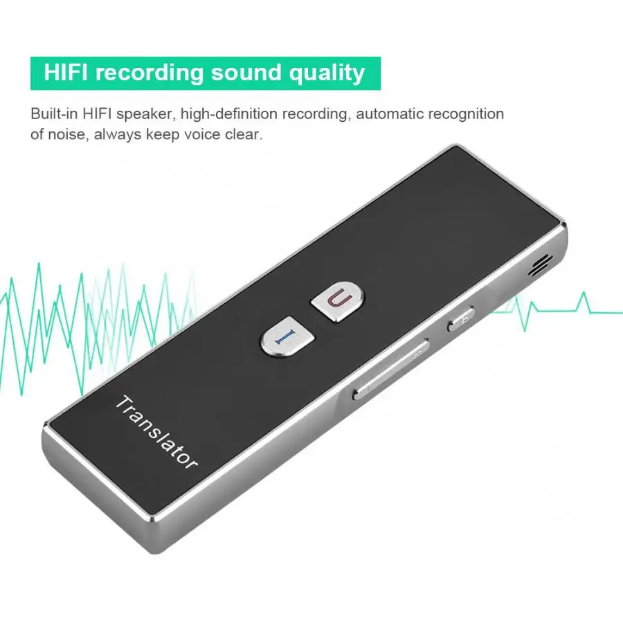 Этот продукт является умным голосовым переводчиком, Интерактивный переводчик в режиме реального времени, который может переводить 40 языков для Обучение, путешествия, бизнес и встречи, такие как английский, китайский, Японский, испанский и многое другое. Используя интеллектуальную технологию распознавания речи, Может переводить звук записи в текст и одновременно передавать в голос Выход. Четкое качество звука, отсутствие шума и простота переноски, это определенно ваш Лучший Коммуникационный партнер.