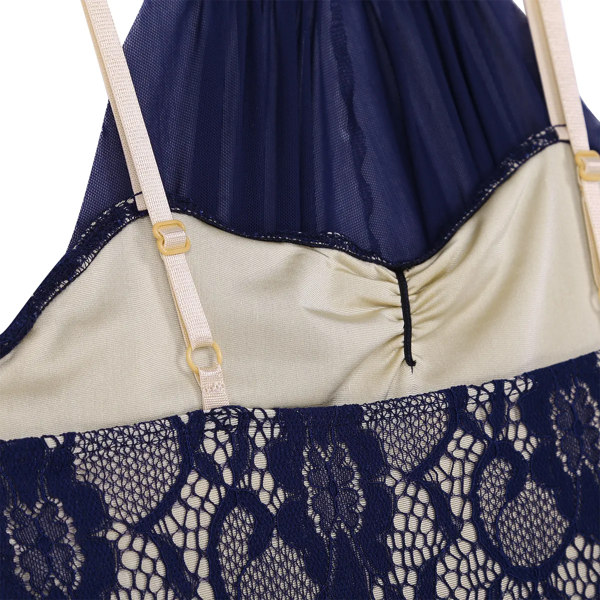 Регулируемые бретельки на бретельках, кружевной лиф с цветочным рисунком и сетчатая подкладка, прикрепленная к воротнику.
