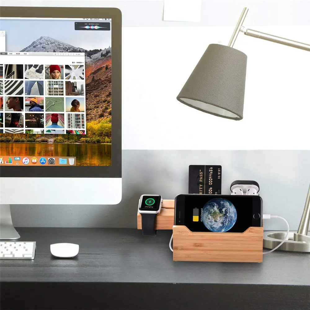 Бамбуковая зарядная станция с 3 USB разъемами питания, управление кабелем, мобильный телефон, зарядная док-станция для iPhone iWatch Airpods(15-40)